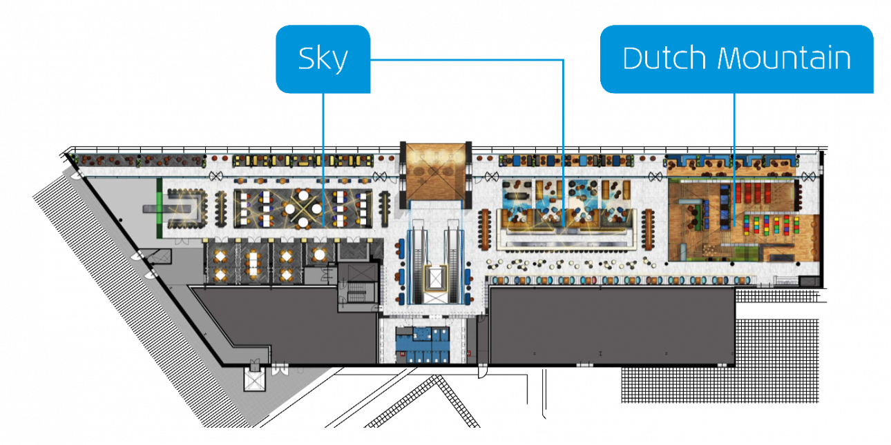 Σε ένα high-end περιβάλλον στην περιοχή «Sky» του δεύτερου ορόφου, οι επισκέπτες μπορούν να απολαύσουν (με χρέωση) εξαιρετικά γεύματα και ποτά που σερβίρονται στο fine dining εστιατόριο και παρακείμενο μπαρ «Blue». Το signature μενού του έχει δημιουργηθεί από τον Γιόρις Μπάιζενταϊκ του RIJKS®, του βραβευμένου εστιατορίου με Michelin στο Rijksmuseum, που δημιούργησε ο σεφ Τζακ Λουτέιν. Συνοδεύεται από μια εξαιρετική λίστα κρασιών που έχει συντάξει ένα νέο ταλέντο από την Ολλανδία, ο Terence Schenk. Το «Blue» προσφέρει επίσης μια ελκυστική συλλογή τυριών, αίθουσα για ποτό και εξωτερική βεράντα με εκπληκτική θέα στους διαδρόμους – μοναδική στον κόσμο. Επιπλέον, δύο ιδιωτικές τραπεζαρίες είναι διαθέσιμες για επαγγελματικές ή άλλες συναντήσεις, οι οποίες μπορούν να δεσμευτούν εκ των προτέρων με χρέωση.