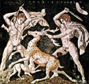 Σύμφωνα με την εικονογραφική ερμηνεία των Φιλίπο Κοαρέλι και Εουτζένιο Λο Σάρντο, η φιγούρα του γηραιού γενειοφόρου που στηρίζεται όρθιος σε μία μαγκούρα γεμάτη κόμπους και φοράει ένα καφέ ιμάτιο πάνω από τον χιτώνα και σανδάλια (κρηπίδες), αποτελεί υποδειγματική απεικόνιση ενός φιλοσόφου, ο οποίος στην προκειμένη περίπτωση θα μπορούσε να είναι ο Αριστοτέλης.