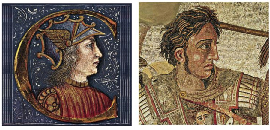 Αλλά στην παγκόσμια εικονογραφία δεν είχαμε κανένα ίχνος του Μεγάλου Αλεξάνδρου, όπως τον σκιαγράφησε ο Πλούταρχος, δίπλα στον Ιούλιο Καίσαρα, στους Παράλληλους Βίους του. «Αυτό μέχρι σήμερα», γράφει η Ρονκέι, «μέχρι την ανακάλυψη που μόλις ανακοίνωσαν δύο μελετητές, ο Φιλίπο Κοαρέλι και ο Εουτζένιο Λο Σάρντο, οι οποίοι θεωρούν ότι εντόπισαν την πιο ρεαλιστική απεικόνιση του προσώπου του Μεγάλου Αλεξάνδρου σε μία έπαυλη που κατά πάσα πιθανότητα ανήκε στον ίδιο τον Ιούλιο Καίσαρα».