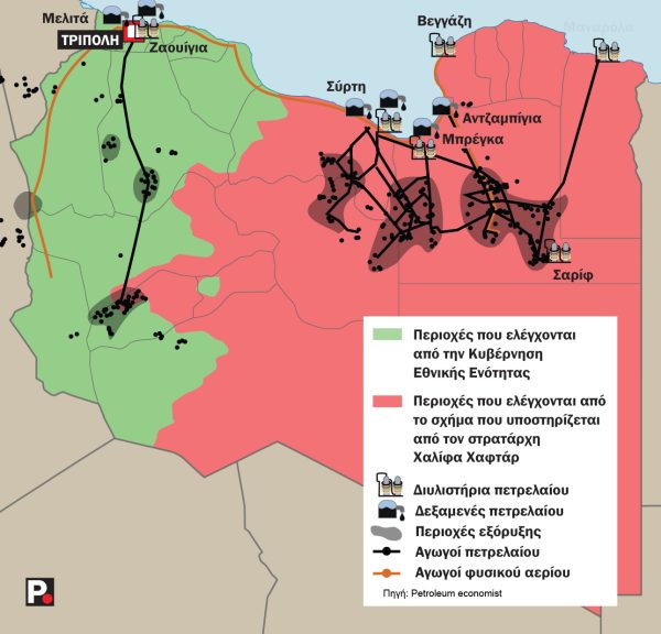 O χάρτης αποτυπώνει τις περιοχές της αναγνωρισμένης από τον ΟΗΕ κυβέρνησης στα ανατολικά και αυτές που ελέγχει ο στρατάρχης Χαφτάρ στα δυτικά: