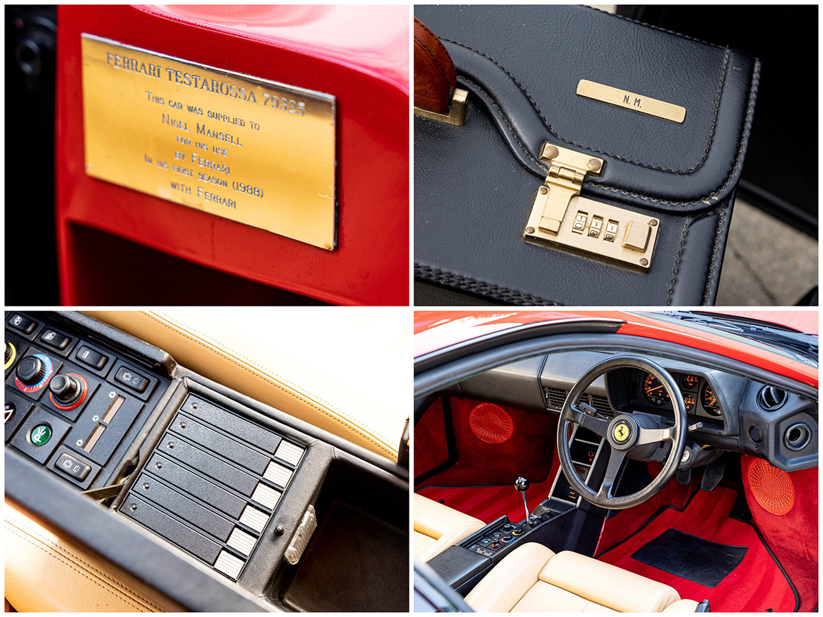 Τέλος πάντων, το θέμα σήμερα είναι η συγκεκριμένη Ferrari Testarossa, το προσωπικό αυτοκίνητο του λεοντόκαρδου Μάνσελ, ενός οδηγού που πέραν του ταλέντου του διακρινόταν και για το θάρρος του στην πίστα. Ο οίκος RM Sotheby’s έχει αναλάβει τη διαδικασία πώλησης ενός πολύ ιδιαίτερου αυτοκινήτου που στις λεπτομέρειές του φροντίζει να υπενθυμίζει ότι στο δεξί του κάθισμα αναπαύονταν τα μαλακά μόρια του Νάιτζελ: σετ από βαλίτσες με χαραγμένο το όνομα του πρωταθλητή, μεταλλικό ταμπελάκι μέσα στο κόκπιτ, ακόμα και στα δερμάτινα προσκέφαλα βρίσκονται τα αρχικά του ονόματός του.