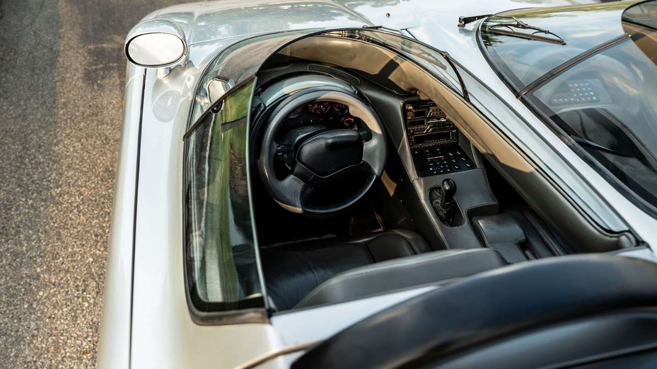 Από κοντά το Aztec Barchetta έδειχνε ακόμα πιο φουτουριστικό απ’ ό,τι βλέπετε στις φωτό. Δύο γυάλινες κάψουλες που ανασηκώνονται προς τα επάνω, παραπέμποντας σε «φτερά γλάρου», διαχωριστικό μεταξύ των επιβατών σαν σε μαχητικό κόκπιτ, μια καμπίνα προσανατολισμένη στη γνωστή εμμονή του μεγάλου σχεδιαστή με την εργονομία, μία κεντρική οθόνη στην κάθετη κονσόλα με το άγνωστο, τότε, σύστημα πλοήγησης και κάτι περίεργες θυρίδες στο πλάι. Το Aztec Barchetta -σε ελεύθερη μετάφραση η «βαρκούλα των Αζτέκων»- έλαμπε σε αυτό το techno-silver. Ήταν όντως από άλλο πλανήτη.