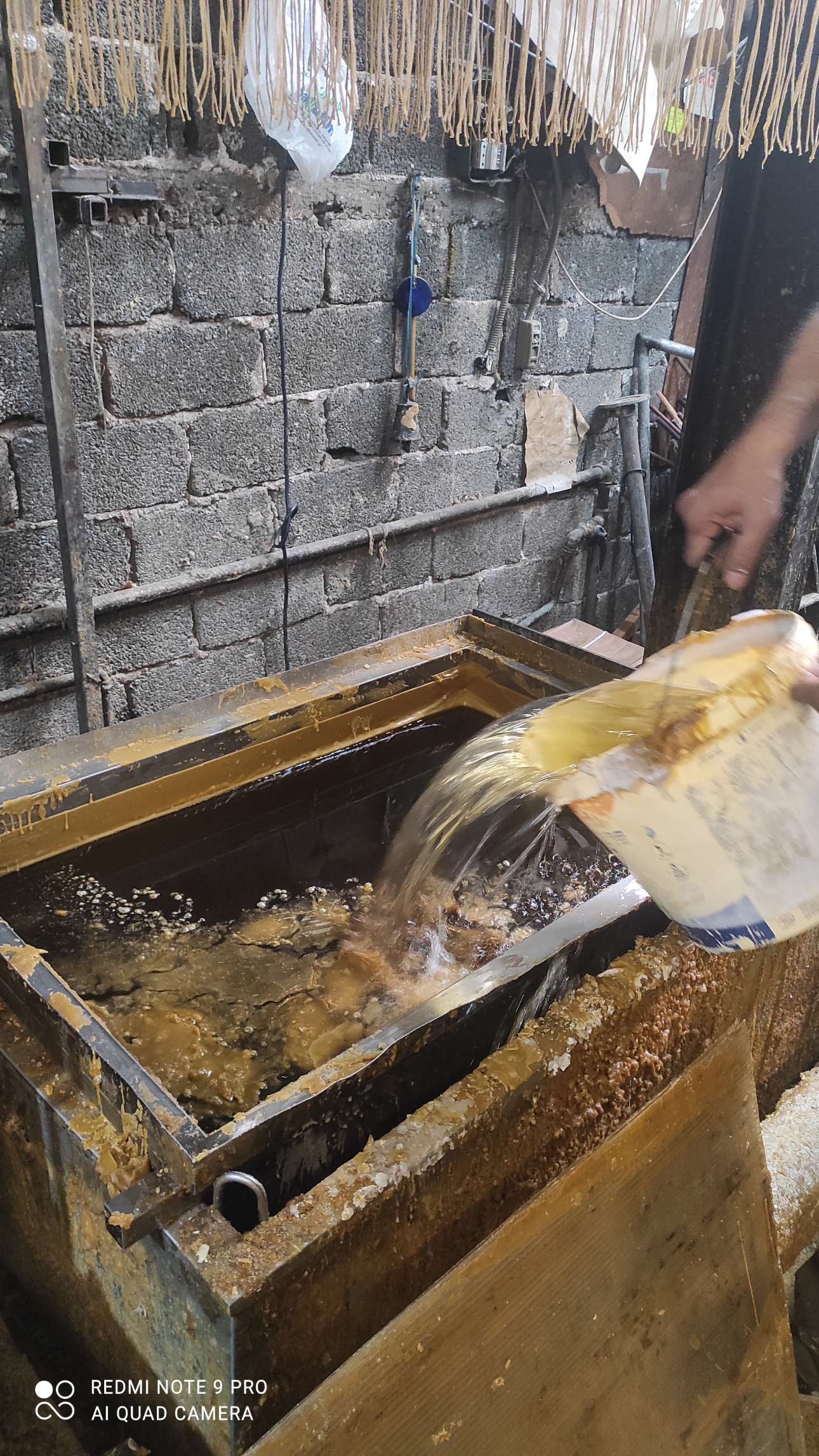 Καθώς τους παρακολουθώ να εργάζονται, συνειδητοποιώ πόσο χοϊκό είναι το περιβάλλον και η διαδικασία. Μια παραγωγή που χρειάζεται ακόμα το ανθρώπινο χέρι, το μάτι και την εμπειρία. Να ρίξεις τον κουβά νερό στο μπεν μαρί του μηχανήματος. Να βουτήξεις τα κεριά όταν πρέπει, να τα αφήσεις να στεγνώσουν όσο χρειάζεται, προτού να ξαναβουτήξεις. Να επαναλάβεις μέχρι να πάρουν το κατάλληλο πάχος. Να καθαρίσεις από το καζάνι το κερί που στερεοποιείται στην επιφάνεια.