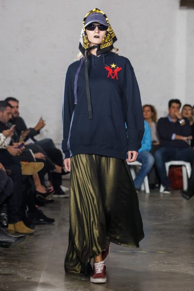 Mέσα στην αποθήκη της Γκαλερί Ζουμπουλάκη στα Πετράλωνα, η κολεξιόν του διατρανώνει λοιπόν ότι η μόδα έχει αλλάξει. Φαρδιά χούντις που νιώθεις ότι έχουν μια γλυπτική βαρύτητα, πάνω από μεταλλικής υφής μακριές φούστες με στενές πιέτες, παντελόνι φόρμας με συγκλονιστικό στενής γραμμής με τονισμένους ώμους δερμάτινο σακάκι, φαρδιά φούστα με αλλεπάλληλες ραφές υφασμάτων κάτω από φαρδιά ζακέτα φόρμας. Και μαζί αξεσουάρ της καθημερινής μας ζωής. Κύματα υφασμάτων και χρωμάτων, αλλεπάλληλα, που έφεραν κωδικούς μόδα, τέχνης και streetlife αισθητικής, όχι στείρες εικόνες των κυρίαρχων προδιαγραφών.