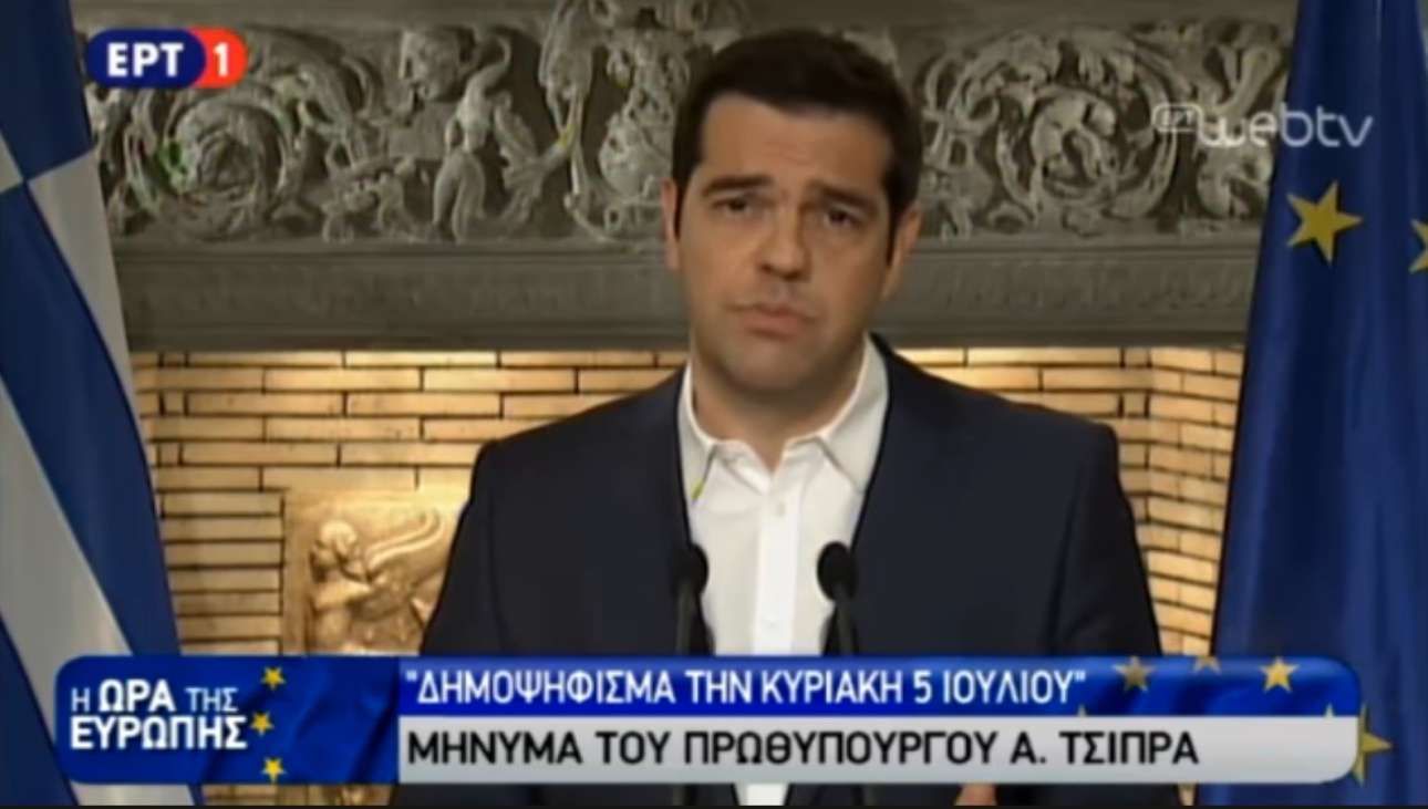 ♦ «Πριν από λίγο συνεδρίασε το Υπουργικό Συμβούλιο στο οποίο εισηγήθηκα την διοργάνωση δημοψηφίσματος, προκειμένου ο ελληνικός λαός κυρίαρχα να αποφασίσει. Η εισήγηση έγινε ομόφωνα αποδεκτή. Αύριο θα συνεδριάσει εκτάκτως η ολομέλεια της Βουλής προκειμένου να επικυρώσει την πρόταση του Υπουργικού Συμβουλίου για δημοψήφισμα την ερχόμενη Κυριακή 5 Ιουλίου με ερώτημα την αποδοχή ή την απόρριψη της πρότασης των θεσμών».