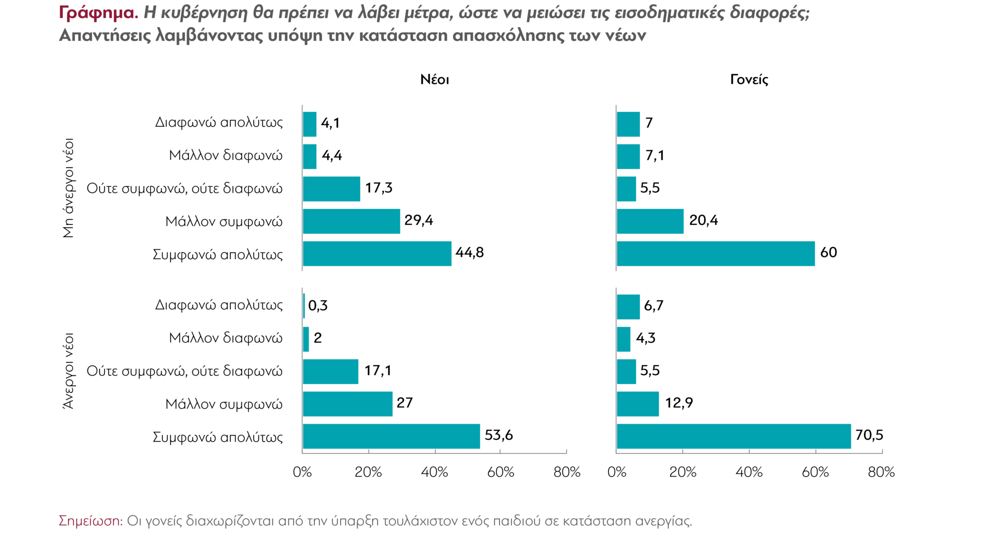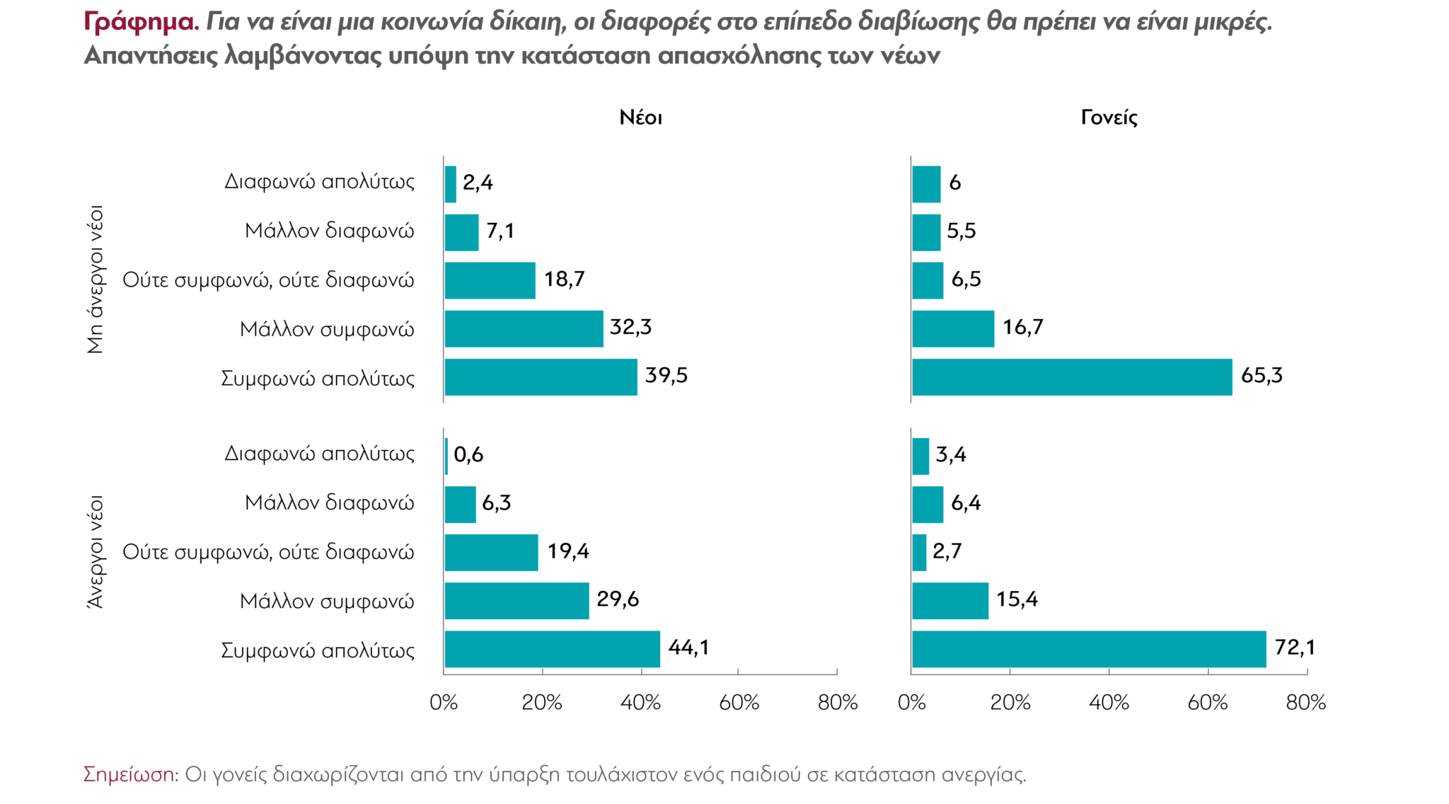- Οι έλληνες νέοι φαίνεται να συμφωνούν αρκετά με τους γονείς τους σε τρία βασικά κοινωνικά ζητήματα που σχετίζονται επίσης με την εργασία. Οι άνεργοι νέοι ήταν πιο πιθανό να ταυτίζονται με τους γονείς τους στην άποψή τους για την κρατική παρέμβαση απέναντι στις ανισότητες εισοδήματος. Είναι δηλαδή πιο πιθανό να δηλώνουν παρόμοια με τους γονείς τους, ότι συμφωνούν ή διαφωνούν με την άποψη ότι «η κυβέρνηση θα πρέπει να λάβει μέτρα ώστε να μειώσει τις εισοδηματικές ανισότητες». Αντίστοιχα, όλοι οι νέοι (αλλά οι άνεργοι πολύ περισσότερο) ήταν πιο πιθανό να ταυτίζονται με τους γονείς τους στην άποψη ότι «για να είναι μια κοινωνία δίκαιη, οι διαφορές στο επίπεδο διαβίωσης θα πρέπει να είναι μικρές». Επιπλέον, οι εργαζόμενοι νέοι ήταν πιο πιθανό να ταυτίζονται με τους γονείς τους στην άποψή τους για την αξιοκρατία, δηλαδή να συμφωνούν ή να διαφωνούν με την άποψη ότι «αυτοί που έχουν καταβάλλει μεγαλύτερη προσπάθεια και έχουν περισσότερα ταλέντα θα πρέπει να αμείβονται περισσότερο». Αντίθετα, και στις τρεις περιπτώσεις, το αν ο νέος που απαντάει είναι άνεργος ή όχι, δεν φαίνεται να παίζει κάποιο ρόλο στην απάντηση που δίνει.
