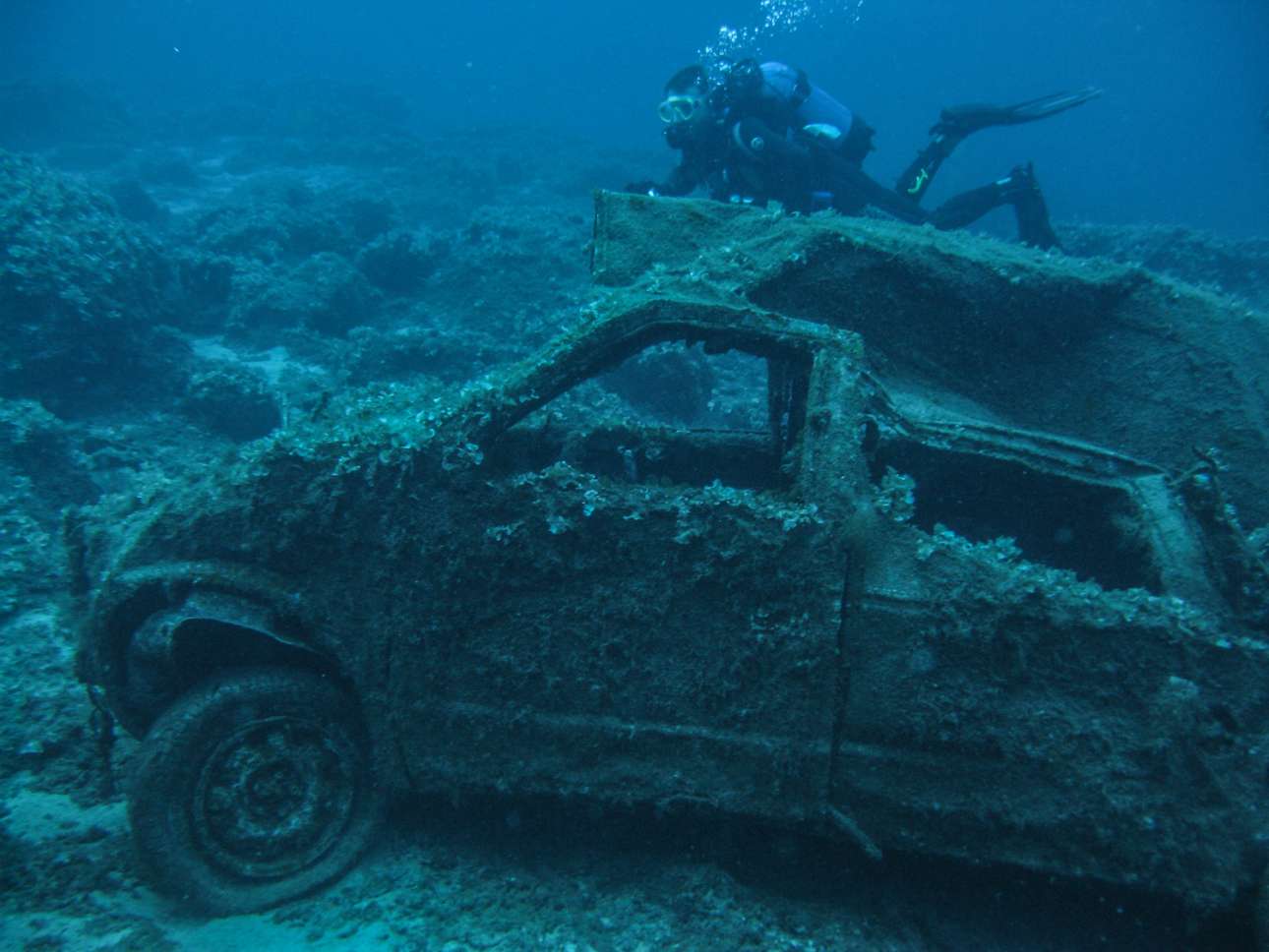 Το σημείο, «Τα αυτοκίνητα», όπως το λένε οι δύτες, ξεκίνησε με 2-3 αυτοκίνητα και κατέληξε να γίνει κανονική υποβρύχια «έκθεση». Διάφορα μοντέλα, ανταλλακτικά που σκόρπισαν από την πτώση, ένα κάρο σίδερα βαθιά σκουριασμένα. Οι άνθρωποι των οικισμών φαίνεται να το ξέρουν το ζήτημα.