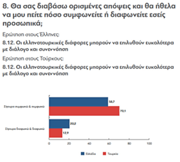 3. Αμφότερες οι δημοσκοπήσεις αναδεικνύουν ότι Ελληνες και Τούρκοι πολίτες προκρίνουν την επίλυση των διμερών διαφορών με ειρηνικά μέσα, μολονότι διαφωνούν ως προς τη διάγνωση των ευθυνών για την απουσία λύσης. Το 59% των Ελλήνων και το 70% των Τούρκων ερωτηθέντων θεωρούν ότι οι ελληνοτουρκικές διαφορές μπορούν να επιλυθούν ευκολότερα με διάλογο και συνεννόηση. Το 68% των Ελλήνων και το 73% των Τούρκων θεωρούν ότι οι Τούρκοι/οι Ελληνες είναι γείτονες και πρέπει να βρεθεί ένας τρόπος φιλικής συμβίωσης μαζί τους.