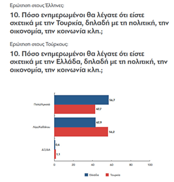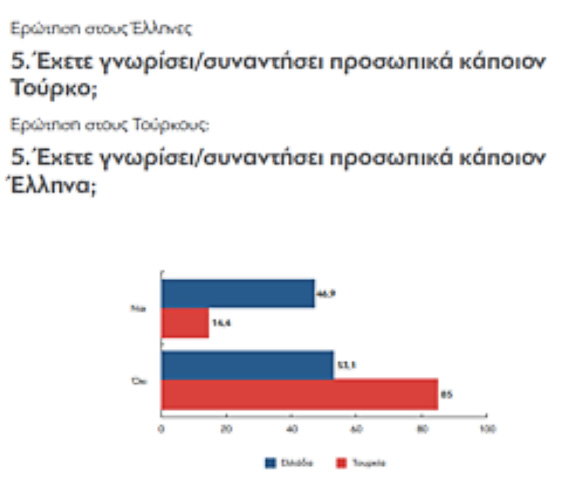 1. Η Τουρκία παραμένει παρούσα στον ελληνικό δημόσιο διάλογο με πολύ εντονότερο τρόπο από ό,τι η Ελλάδα στον τουρκικό δημόσιο διάλογο. Η Ελλάδα παραμένει εκτός του οπτικού πεδίου του μέσου τούρκου πολίτη. Ελάχιστοι έχουν μεγαλώσει ακούγοντας αρνητικές αναφορές για τους Ελληνες, αλλά και ελάχιστοι έχουν επισκεφθεί την Ελλάδα. Μόλις 3% των Τούρκων δηλώνουν ότι έχουν επισκεφθεί την Ελλάδα έναντι 37% των Ελλήνων που έχουν επισκεφθεί την Τουρκία. Το 47% των ερωτηθέντων Ελλήνων δηλώνουν ότι έχουν γνωρίσει κάποιον Τούρκο, ενώ το αντίστοιχο ποσοστό των ερωτηθέντων Τούρκων που έχουν γνωρίσει κάποιον Ελληνα είναι μόλις 14%. Μια ισχυρή πλειοψηφία και στις δύο χώρες (ισχυρότερη όμως στην Τουρκία) δηλώνει ότι θα μπορούσε να έχει έναν πολίτη της γείτονος για φίλο τους: 60% των Ελλήνων και 74% των Τούρκων δηλώνουν ότι θα μπορούσαν να έχουν ως φίλο έναν Τούρκο ή Ελληνα αντίστοιχα.