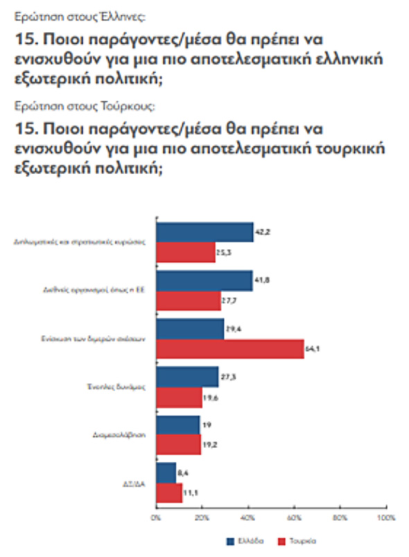 6. Ενώ η πλειονότητα της τουρκικής κοινής γνώμης δηλώνει την υποστήριξή της στην ένταξη της Τουρκίας στην Ευρωπαϊκή Ένωση, η αντίθεση της πλειονότητας της ελληνικής κοινής γνώμης στην ένταξη της Τουρκίας στην Ευρωπαϊκή Ένωση δείχνει ότι η στρατηγική που μετέτρεπε την ενταξιακή πορεία της Τουρκίας σε εργαλείο για την επίλυση των ελληνοτουρκικών διαφορών δεν θεωρείται πλέον ρεαλιστική. Οπως προκύπτει και από τις εις βάθος συνεντεύξεις, αναζητείται πλέον άλλος μοχλός για την προώθηση της επίλυσης των διμερών διαφορών επί τη βάσει του διεθνούς δικαίου.