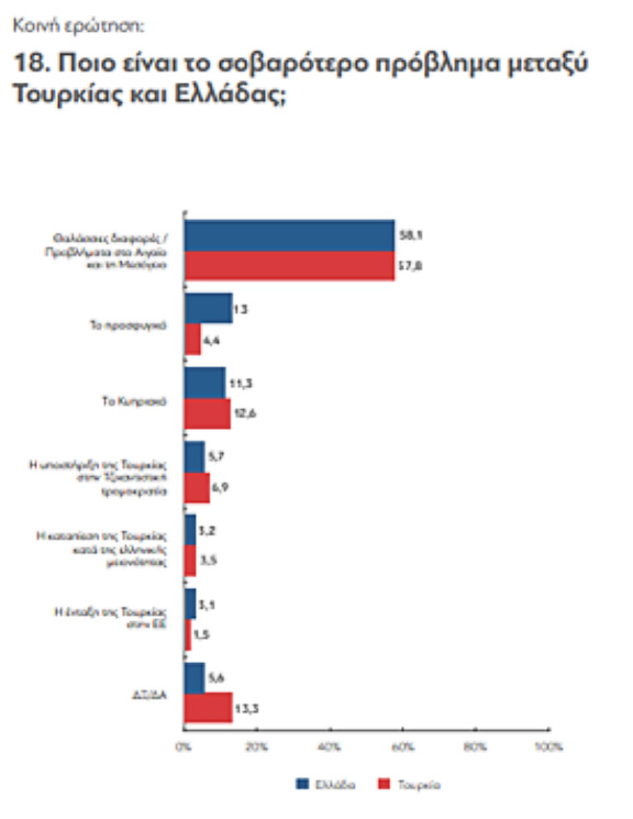 4.Ενώ η πλειονότητα των πολιτών και στις δύο χώρες εμφανίζεται να ανησυχεί για το ενδεχόμενο θερμού επεισοδίου, αυτή η ανησυχία αποτυπώνεται ισχυρότερη στην ελληνική παρά στην τουρκική κοινή γνώμη. Τούτο εξηγείται και λόγω της υπερέκθεσης της τουρκικής κοινής γνώμης σε ειδήσεις πολεμικής εμπλοκής της Τουρκίας κατά τα τελευταία χρόνια.