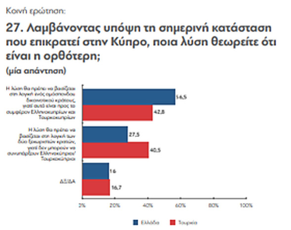 8. Παρά το γεγονός ότι η σημασία που αποδίδουν η ελληνική και τουρκική κοινή γνώμη στο Κυπριακό φθίνει, είναι ενδιαφέρον ότι η πλειονότητα των ερωτηθέντων και στις δύο χώρες συμφωνούν στη λύση διζωνικής δικοινοτικής ομοσπονδίας. Τούτο έχει ιδιαίτερη σημασία με δεδομένη και την πρόσφατη αναβίωση του διεθνούς ενδιαφέροντος για το Κυπριακό, αλλά και την υπαναχώρηση της Τουρκίας και της τουρκοκυπριακής ηγεσίας στην υποστήριξη λύσης διχοτομικού χαρακτήρα.