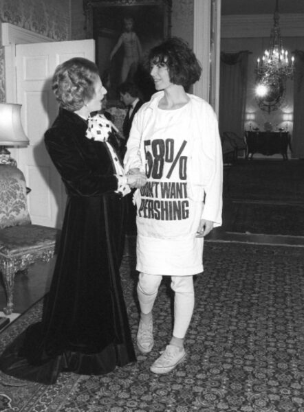 Γνωστή για τα πολιτικά μηνύματα στα ρούχα της, η σχεδιάστρια Κάθριν Χάμνετ πήγε με ένα μακρύ t-shirt με αντιπυρηνικό σύνθημα σε δεξίωση που διοργάνωσε η Μάργκαρετ Θάτσερ στην πρωθυπουργική κατοικία στην Ντάουνινγκ Στριτ του Λονδίνου, τον Μάρτιο του 1984. Εγραφε με μεγάλα μαύρα γράμματα «το 58% δεν θέλει τους Πέρσινγκ», μια αναφορά σε δημοσκοπήσεις που έδειχναν την αντίθεση του κόσμου στην εγκατάσταση των πυραύλων Πέρσινγκ στην Ευρώπη.