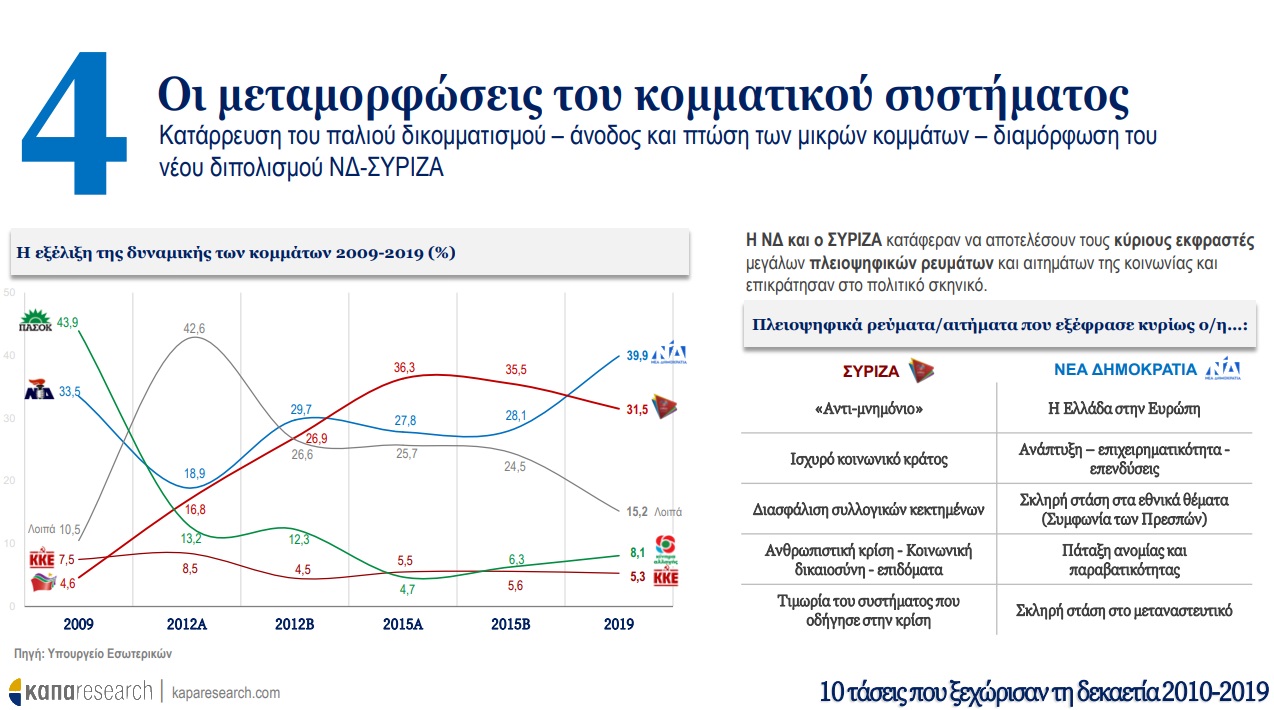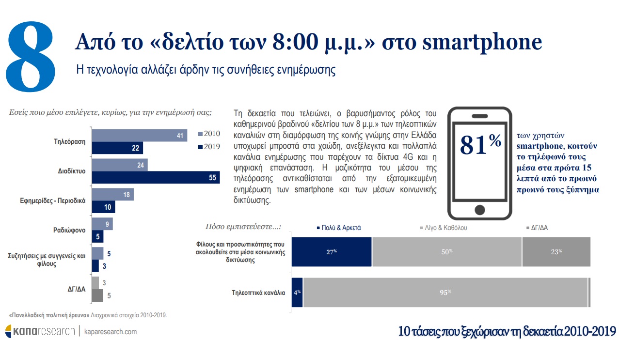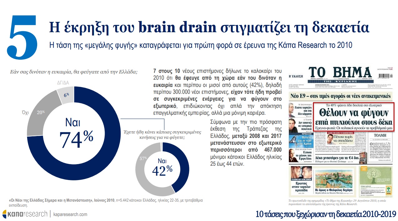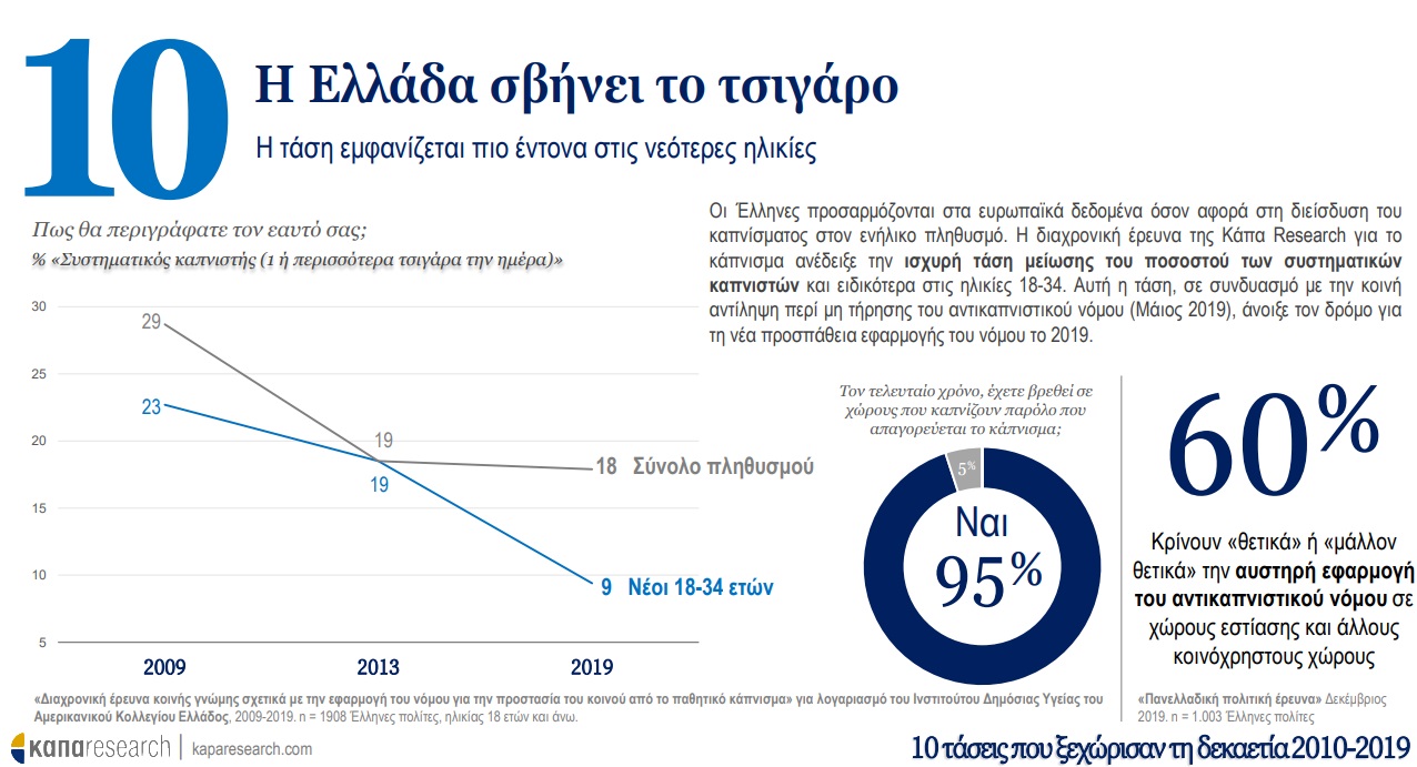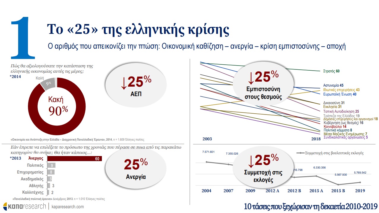 Σε πρώτη φάση, η Κάπα Research παρουσιάζει τις τάσεις που ξεχώρισαν τη δεκαετία 2010-2019 στην Ελλάδα και οι οποίες προκλήθηκαν από την ιστορική συγκυρία και την εξέλιξη τεσσάρων παραγόντων: οικονομική κρίση, ψηφιακή επανάσταση, προσφυγική κρίση και μεταβολές στις διεθνείς ισορροπίες δυνάμεων. O αριθμός της κρίσης –ένα επάρατο «25%»–, το brain drain, η αλλαγή του τρόπου πληροφόρησης των πολιτών (από την τηλεόραση στο smartphone) ακόμα και το κάπνισμα είναι όλα εδώ, μια δεκάδα που μπορεί να περιγράψει τα δέκα προηγούμενα χρόνια.