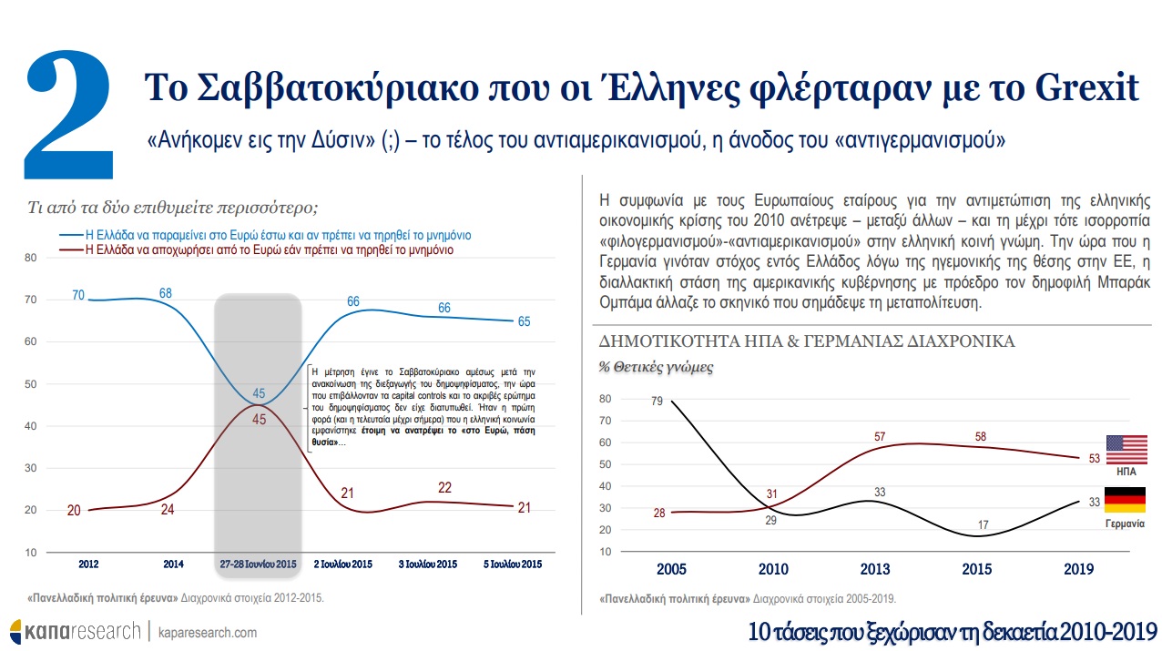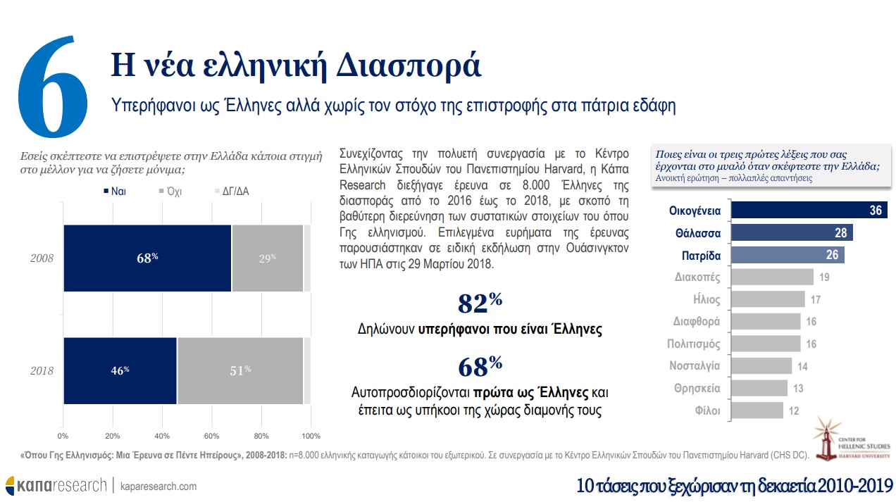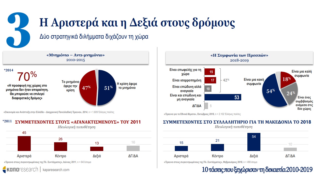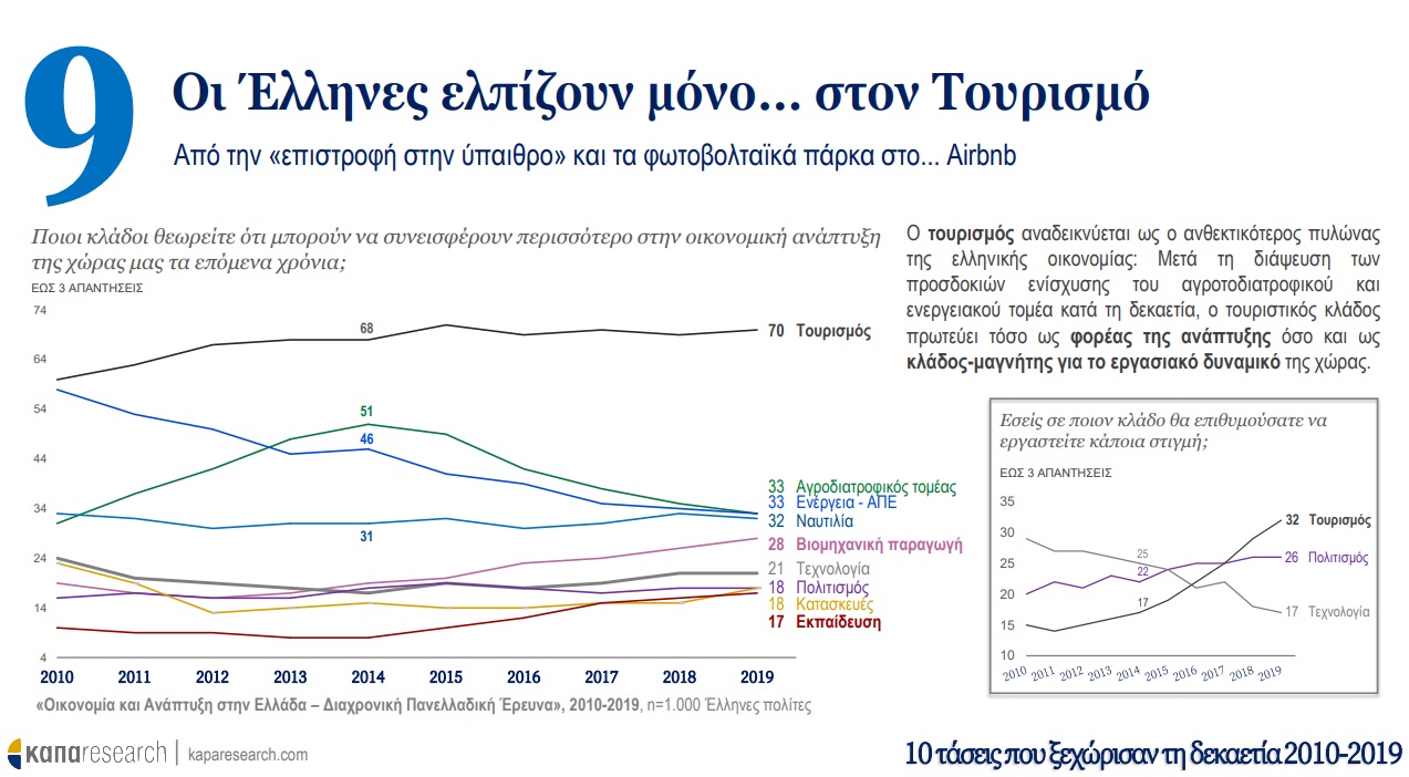 Σε πρώτη φάση, η Κάπα Research παρουσιάζει τις τάσεις που ξεχώρισαν τη δεκαετία 2010-2019 στην Ελλάδα και οι οποίες προκλήθηκαν από την ιστορική συγκυρία και την εξέλιξη τεσσάρων παραγόντων: οικονομική κρίση, ψηφιακή επανάσταση, προσφυγική κρίση και μεταβολές στις διεθνείς ισορροπίες δυνάμεων. O αριθμός της κρίσης –ένα επάρατο «25%»–, το brain drain, η αλλαγή του τρόπου πληροφόρησης των πολιτών (από την τηλεόραση στο smartphone) ακόμα και το κάπνισμα είναι όλα εδώ, μια δεκάδα που μπορεί να περιγράψει τα δέκα προηγούμενα χρόνια.