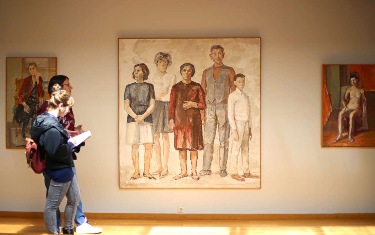 Η Κατοχή του Παππά είναι αποτυπωμένη με τον πιο αποστομωτικό τρόπο μέσα από το πορτρέτο ενός αγοριού. Ολο ασπρόμαυρο, με κόκκινα, λες και είναι ματωμένα, χέρια. Το ίδιο αγόρι, υπαρκτό πρόσωπο, στέκει και ως ολόκληρο γλυπτό λίγα βήματα πιο πέρα από τον πίνακα. Υπάρχει επίσης και το ομαδικό πορτρέτο μιας οικογένειας βιοπαλαιστών που ζούσε εκεί κοντά, με την αθάνατη Ελληνίδα μάνα να στέκεται στο κέντρο, σύμβολο μιας γενιάς που δεν το βάζει κάτω.