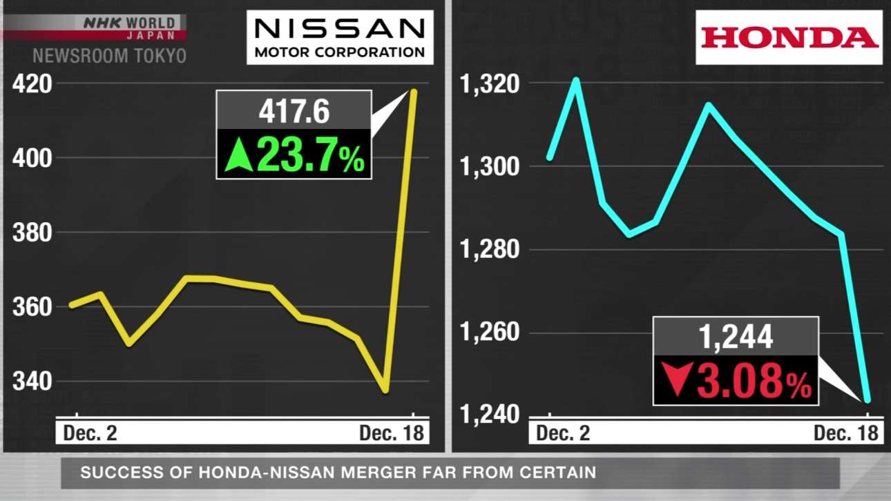 Ακριβώς επειδή η Nissan τεκμαίρεται ότι θα επωφεληθεί πιο άμεσα, η μετοχή της ανέβηκε κατά 23,7% ενώ, αντίθετα, της Honda έπεσε κατά 3,8%. Ωστόσο υπάρχει πολύς δρόμος μπροστά και αυτές οι αρχικές τάσεις μεταβάλλονται αναλόγως των εξελίξεων.