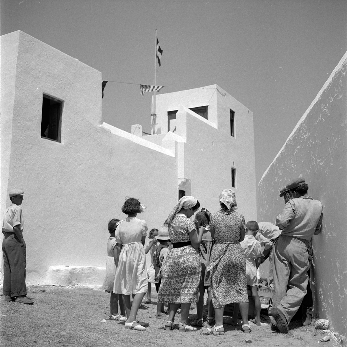«Από την ημέρα του 1955, που εμφάνισα τις φωτογραφίες της Μυκόνου, η πιο ανεξίτηλη εικόνα από αυτές ήταν εκείνη που τράβηξα σε μια βάφτιση στη Μονή του Αγίου Παντελεήμονα. Μια ποζαρισμένη εικόνα, αντίθετα με τις περισσότερες, που όμως πάντα ‘μιλούσε’ στην καρδιά μου. Μια εικόνα από ανθρώπους, φίλους, συγγενείς, που στην αυλή του μοναστηριού έτρωγαν σε τσίγκινα πιάτα, πάνω σε τραπεζομάντηλο από εφημερίδες.