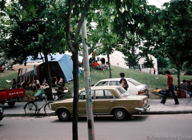 Το πρωί της Τετάρτης, λίγες ώρες μετά τον καταστροφικό σεισμό, μας βρήκε στα χορταράκια απέναντι από την πανεπιστημιακή βιβλιοθήκη. Στην ανηφόρα μέχρι το ΑΧΕΠΑ είχαν κοιμηθεί εκατοντάδες με κουβέρτες, σεντόνια, υπνόσακους, στρώματα και μαξιλάρια. Φοβερή εικόνα: πριν από τις έξι το πρωί με τις πρώτες αχτίδες του ήλιου, έβλεπες κόσμο να πλένεται με φιάλες νερού, να πλένει τα δόντια του, ακόμα και να αλλάζει πίσω από κρεμασμένες κουβέρτες και πετσέτες. Άλλοι είχαν ανοίξει τρανζίστορ για να μάθουν τα νέα και το τι μέλλει γενέσθαι… Κορίτσια με σορτς, φλερτάκια για μια ανθρώπινη κουβέντα, για εξορκισμό του φόβου.