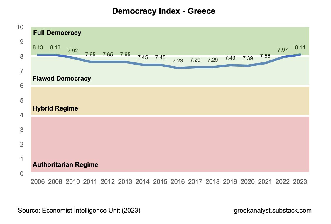Στην έκθεση αναφέρεται ότι «η Ελλάδα συγκεντρώνει κορυφαία βαθμολογία (δέκα στα δέκα) για την εκλογική διαδικασία και τον πλουραλισμό, επίτευγμα που μοιράζονται μόνο δώδεκα άλλες χώρες». Σημειώνεται επίσης ότι έχει «έχει σταθερή βαθμολογία για τις πολιτικές ελευθερίες (8,82), για τις οποίες η βαθμολογία της επίσης βελτιώθηκε το 2022».