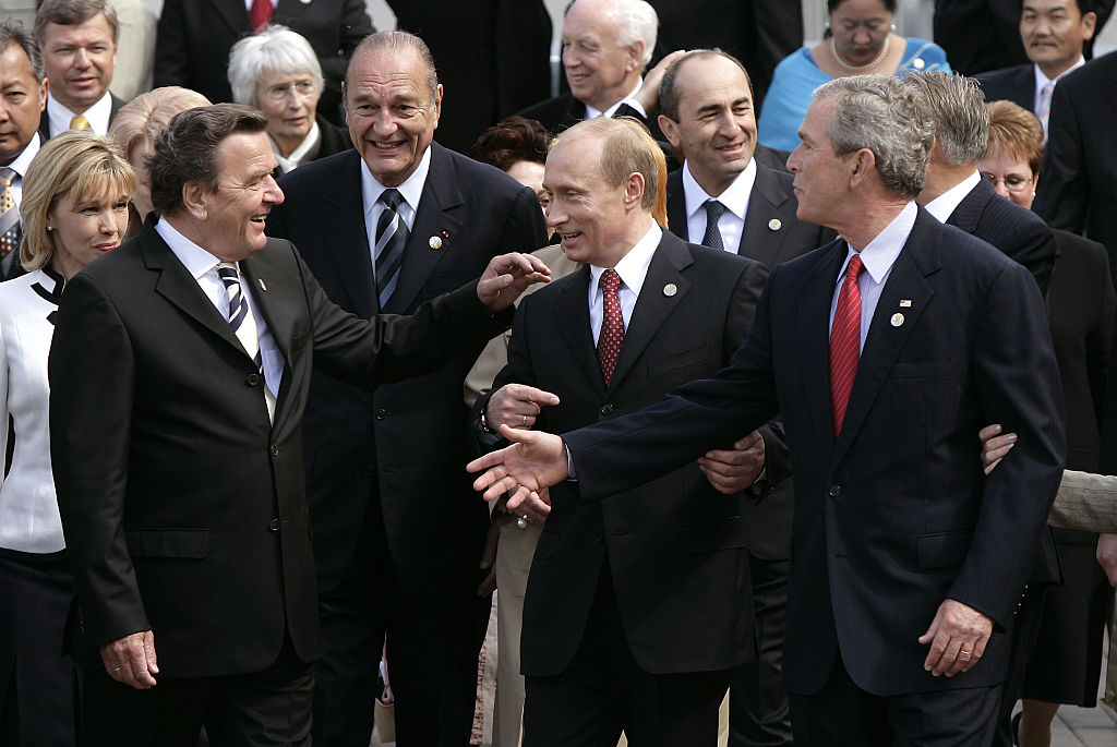 Μόσχα, 9 Μαΐου 2005. Στην πρώτη σειρά ξεχώριζαν ο γερμανός καγκελάριος Γκέρχαρντ Σρέντερ, ο γάλλος πρόεδρος Ζακ Σιράκ και ο πρόεδρος της Κίνας Χου Ζιντάο. Σε περίοπτη θέση, δίπλα στον Βλαντίμιρ Πούτιν, καθόταν ο αμερικανός πρόεδρος Τζορτζ Μπους. Μία, δύο σειρές πιο πίσω διακρινόταν ο πρωθυπουργός της Ιταλίας Σίλβιο Μπερλουσκόνι, έχοντας δίπλα του από τη μία πλευρά τον ισπανό ομόλογό του Χοσέ Λουίς Θαπατέρο και από την άλλη τον πρωθυπουργό της Ιαπωνίας Τζουνιτσίρο Κοϊζούμι. Το «παρών» στην παρέλαση είχε δώσει επίσης ο τότε πρόεδρος της Ευρωπαϊκής Επιτροπής Ζοζέ Μανουέλ Μπαρόζο, παρά τις προστριβές μεταξύ Βρυξελλών και Μόσχας για ζητήματα δασμών. Συνολικά ήταν εκεί 150 ξένοι αξιωματούχοι, με 50 αρχηγούς κρατών ανάμεσά τους.