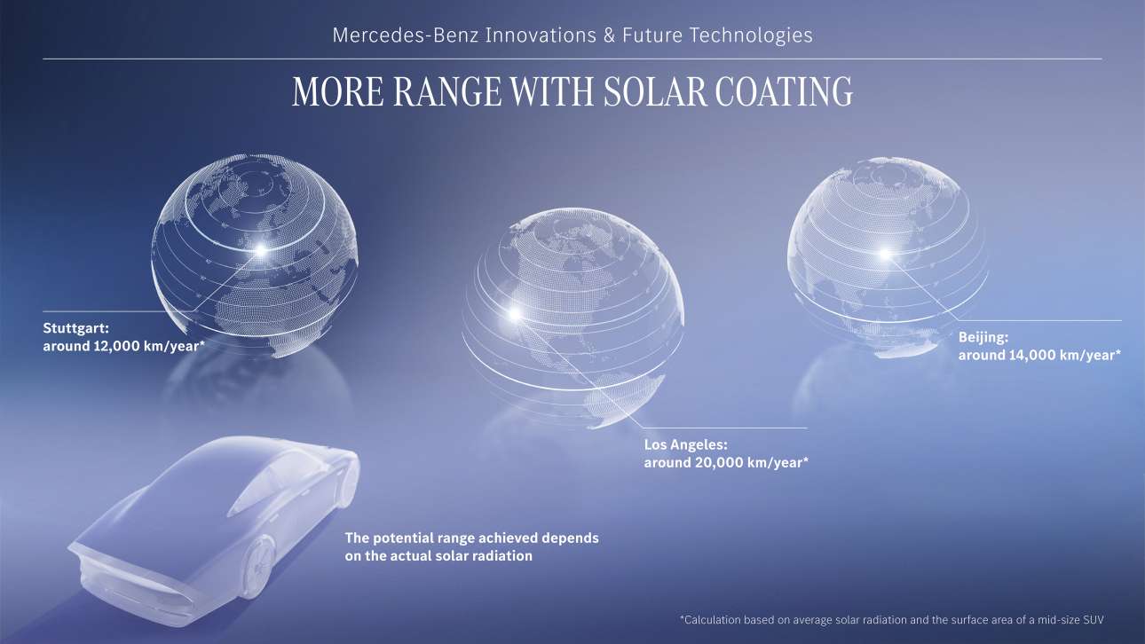 Εν προκειμένω ωστόσο, η Mercedes-Benz το προχωρά αρκετά βήματα παραπέρα. Συγκεκριμένα, ισχυρίζεται ότι η επίστρωση του αμαξώματος με μικροσωματίδια χρώματος που μπορούν να αποθηκεύσουν ηλιακή ενέργεια είναι ικανά να αυξήσουν την αυτονομία ενός EV μέχρι και 20.000 χιλιόμετρα το χρόνο. Φυσικά σε περιοχές με μεγάλη ηλιοφάνεια. Ας πούμε, όπως έχουν υπολογίσει, στο Λος Αντζελες. Ή, αν είσαι Στουτγάρδη, τη φυσική έδρα της Mercedes, περίπου 12.000 χιλιόμετρα. Και κάποια 14.000 χιλιόμετρα στο Πεκίνο. Αθήνα; Με τόσο ήλιο, μάλλον προσθέστε κάτι παραπάνω.
