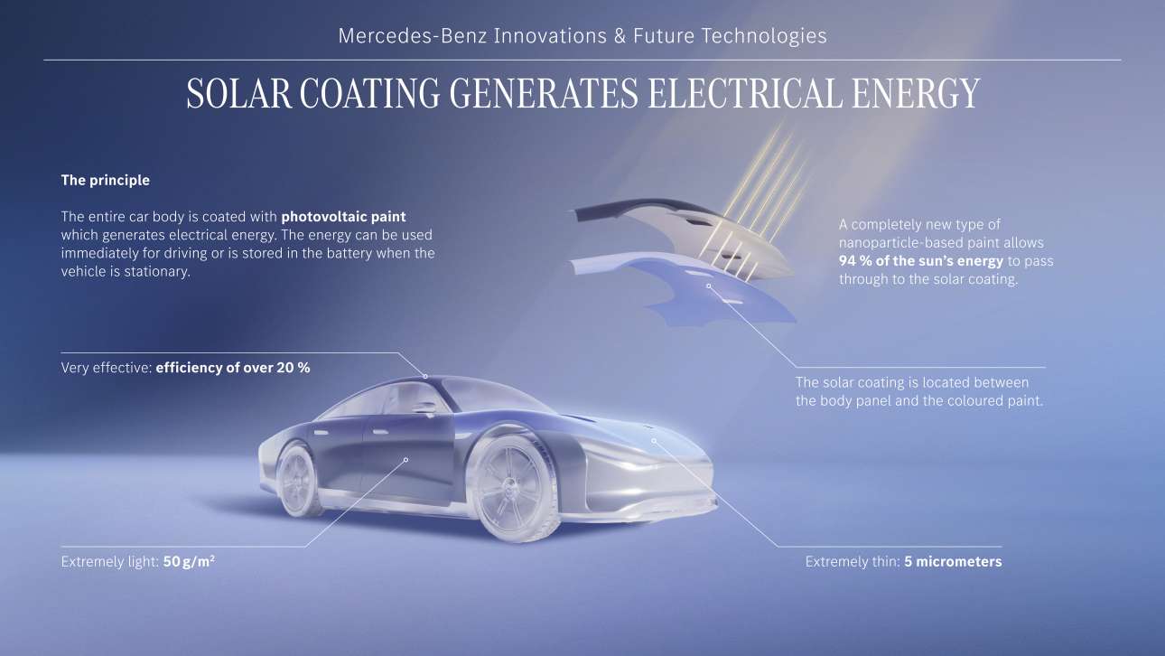 Σε κάθε περίπτωση, η νέα τεχνολογία (Solar Coating) είναι με τη μορφή μιας ειδικής πάστας, λεπτότερης από μία τρίχα, που τοποθετείται σε όλα τα μέρη του αμαξώματος και αποθηκεύει την ηλιακή ακτινοβολία. Το σύστημα λειτουργεί ακόμα κι όταν το αυτοκίνητο είναι παρκαρισμένο, δηλαδή κατά τον μεγαλύτερο χρόνο ζωής του. Επίσης, όπως σημειώνει ο Ρόμπερτ Χόι, καθηγητής Ανόργανης Χημείας στο Πανεπιστήμιο της Οξφόρδης, «η τεχνολογία ευνοείται πλέον από νέους ημιαγωγούς που μπορούν να απορροφούν περισσότερη ενέργεια απ’ ό,τι η κλασική σιλικόνη που χρησιμοποιείται στα περισσότερα ηλιακά πάνελ. Κάτι τέτοιο σημαίνει πως απαιτούνται λιγότερα υλικά».