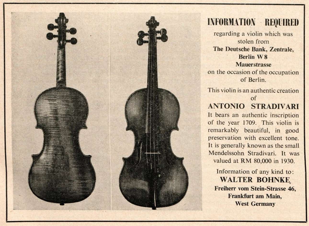 Καθώς η Γερμανία βυθιζόταν στο χάος στο τέλος του Β’ Παγκοσμίου Πολέμου, ένα σπάνιο βιολί από το φημισμένο εργαστήριο του ιταλού οργανοποιού Αντόνιο Στραντιβάρι λεηλατήθηκε από τραπεζική θυρίδα στο Βερολίνο. Το όργανο, κατασκευασμένο το 1709 κατά τη χρυσή εποχή της κατασκευής βιολιών, είχε κατατεθεί εκεί χρόνια νωρίτερα από την οικογένεια Μέντελσον-Μπόνκε, καθώς οι περιουσίες των Εβραίων κινδύνευαν από τις ναζιστικές διώξεις.