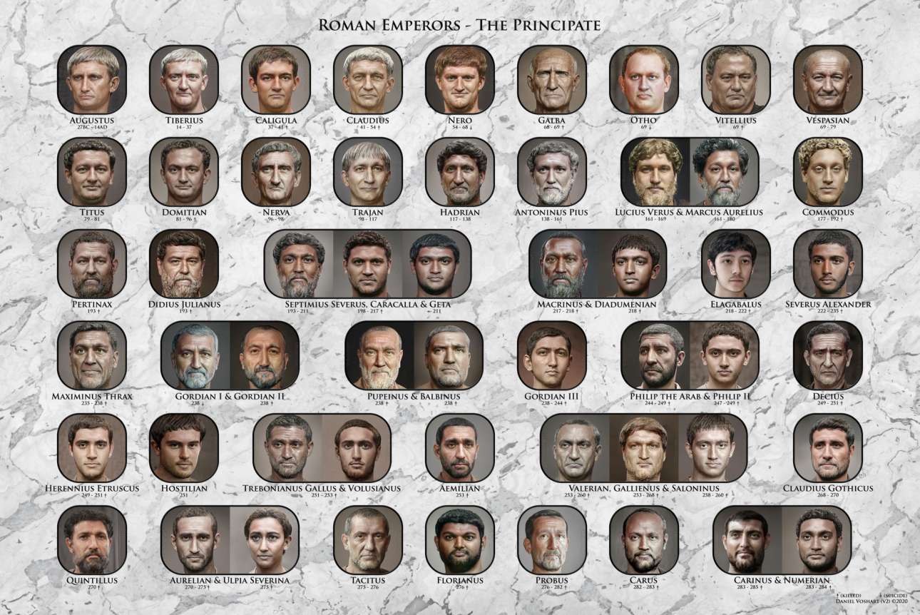 Συνήθως τους φέρνουμε στο μυαλό μας όπως έχουν απεικονιστεί σε εξιδανικευμένες μονόχρωμες προτομές. Πρόσφατα, όμως, ένας καναδός designer αξιοποίησε την Τεχνητή Νοημοσύνη για να δημιουργήσει φωτορεαλιστικά, έγχρωμα πορτρέτα 54 αυτοκρατόρων, με βάση όχι μόνο αρχαία γλυπτά αλλά επίσης περιγραφές συγγραφέων και άλλα στοιχεία.