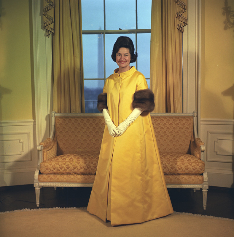 Η σύζυγος του 36ου προέδρου των ΗΠΑ Λίντον Τζόνσον, φόρεσε ένα κίτρινο σατέν φόρεμα σχεδιασμένο από τον Τζον Μουρ που αγοράστηκε από το κατάστημα Neiman Marcus στο Τέξας. Η συντηρητική απόλυτα αμερικανική εμφάνισή της ολοκληρώθηκε με λευκά γάντια και μαργαριτάρια, που κρίθηκαν κατάλληλα για την ορκωμοσία, η οποία πραγματοποιήθηκε μόλις έναν χρόνο μετά τη δολοφονία του προέδρου Κένεντι.