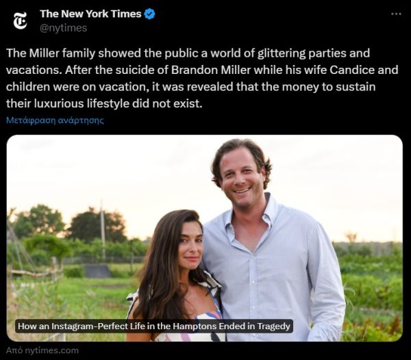 Πριν από έναν μήνα, μια άλλη παρόμοια ιστορία έγινε γνωστή, αυτή που αφορά τους Μίλερ. Το ζευγάρι έγινε γνωστό στους κοσμικούς κύκλους του Μεγάλου Μήλου λόγω των πάρτι στη βίλα του Χάμπτονς. Η Κάντις διατηρούσε και λογαριασμό Instagram, τον «Mama & Nanny», διά του οποίου συμβούλευε για θέματα μόδας και ομορφιάς 80.000 άτομα. Στην πραγματικότητα, όμως, τα χρέη έπνιγαν το ζευγάρι και ήταν αυτά, τελικά, που οδήγησαν τον σύζυγο της Κάντις, τον Μπράντον, στην αυτοκτονία.