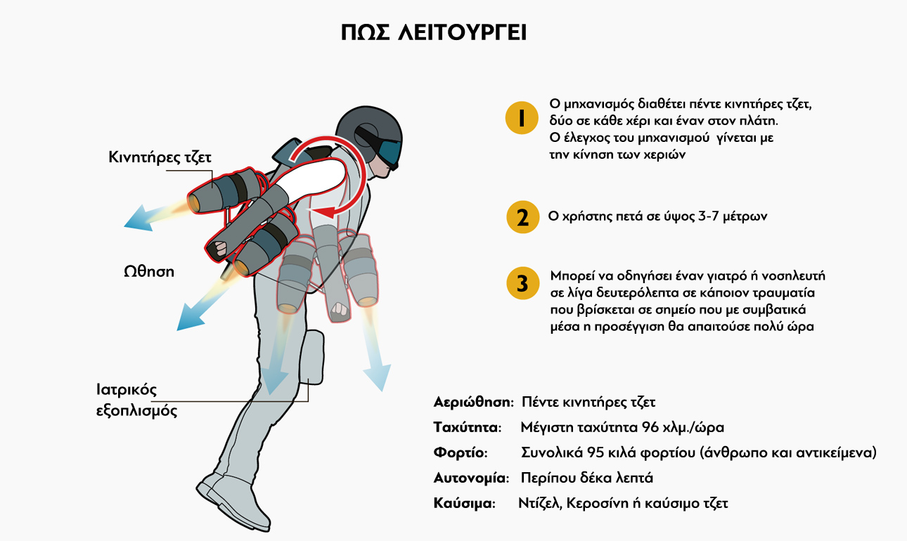 Ο ιπτάμενος νοσηλευτής χρειάστηκε μόλις 90 δευτερόλεπτα για να φτάσει στα άτομα που ζητούσαν βοήθεια, ενώ αν η προσέγγιση γινόταν ακόμα και με ελικόπτερο, θα περνούσε αρκετή ώρα. «Ο μηχανισμός λειτουργεί με κινητήρες αεριώθησης τζετ, παρόμοιους με αυτούς των αεροσκαφών, αλλά σε πολύ μικρό μέγεθος. Τον έλεγχο του μηχανισμού έχει ο χρήστης, ο οποίος πετά σε χαμηλό ύψος από το έδαφος, ώστε σε περίπτωση που για κάποιον λόγο πέσει, να μην κινδυνεύσει η ζωή του» δηλώνει ο Μπράουνιγκ. H Gravity Industries κοστολόγησε τον «Ιπτάμενο Γιατρό» στα 370.000 ευρώ.