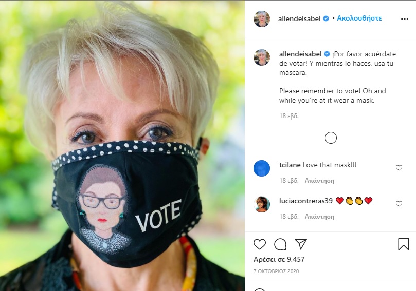 Η Αλιέντε μίλησε με τη Φιόνα Στέρτζες, δημοσιογράφο του Guardian, με βιντεοκλήση από το σπίτι της στην Καλιφόρνια, όπου κατοικεί από το 1988 (έγινε Αμερικανίδα πολίτης το 1993) και όπου τώρα ζει με τον τρίτο σύζυγό της, Ρότζερ Κούκρας. Το lockdown, λέει, δεν την έχει καταβάλει: «Σηκώνομαι κάθε πρωί περίπου στις 6. Πίνω ένα φλιτζάνι καφέ, έπειτα κάνω ντους και μετά μακιγιάρομαι κανονικά σαν να πρόκειται να πάω στην όπερα. Ντύνομαι, φοράω ψηλά τακούνια και ανεβαίνω στη σοφίτα όπου δουλεύω. Δεν θα δω κανέναν, ούτε καν τον ταχυδρόμο, αλλά ντύνομαι για τον εαυτό μου».