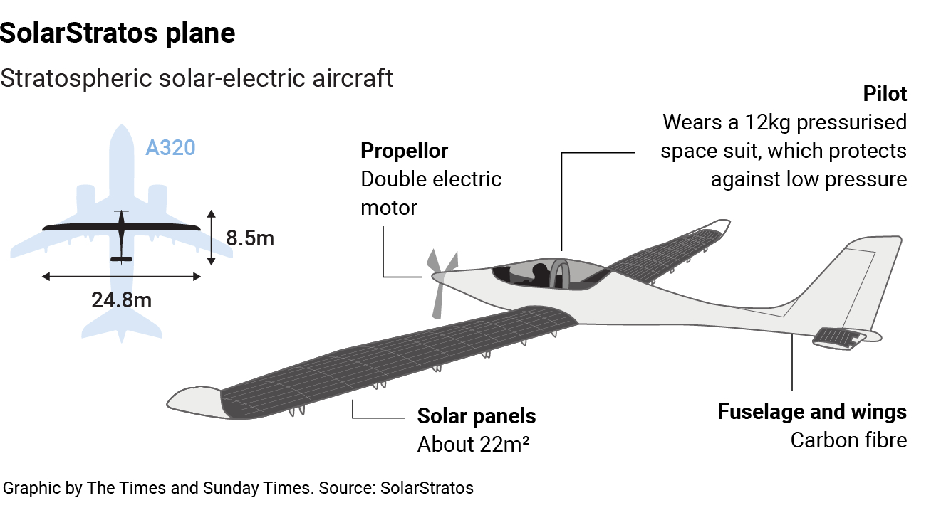 Ο Ραφαέλ Ντομζάν, σημειώνουν οι Times, έφτασε τα 9.521 μέτρα με το πειραματικό SolarStratos, αφού το αεροσκάφος με έλικα ανυψώθηκε, με τη βοήθεια ανοδικών θερμών ρευμάτων αέρα, μετά την απογείωσή του από την πόλη Σιόν, στη νοτιοδυτική Ελβετία.