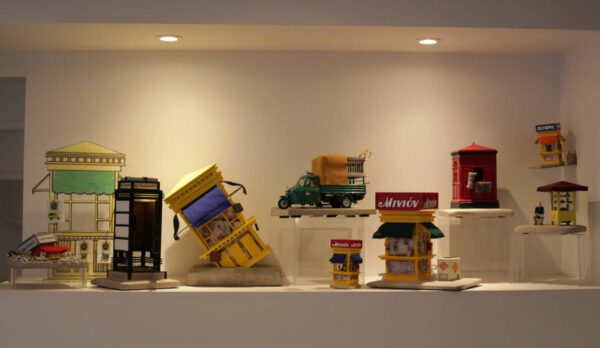 Η πρώτη ατομική του έκθεση, είναι μια ρετροσπεκτίβα όσων έχει κατασκευάσει τα τελευταία χρόνια, αλλά αποτελεί και μια εισαγωγή στις επόμενες φιλοδοξίες του. Παρουσιάζεται μια σειρά των κλασικών περιπτέρων του καλλιτέχνη σε διάφορα μεγέθη, αλλά κάπου μέσα σε αυτά υπάρχει και μια φωτιζόμενη μακέτα του Ρεξ, τηλεφωνικοί θάλαμοι, ένα παλιό τρίκυκλο φορτωμένο με έναν Παρθενώνα από μπετόν αρμέ και ελενίτ, ένας κουλουρτζής καθισμένος δίπλα στο κιόσκι του, αλλά κι ένα αποδομημένο περίπτερο, βουλιαγμένο σε χαλάσματα, ως σημείο αναφοράς στο περίπτερο της Πανεπιστήμιου που γκρεμίστηκε κατά τις εργασίες του μετρό το 1997. Ανάμεσα στα έργα, υπάρχουν και κάποια σουρεαλιστικά, όπου ο καλλιτέχνης έχει εγκλωβίσει άσχετες πραγματικότητες εντός περιπτέρων.