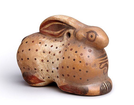 Ελεύθερη απόδοση πήλινης κουδουνίστρας σε μορφή λαγού. Το έκθεμα (Ιερό Νύμφης, προθήκη 6 αρ. 134) βρίσκεται στο ισόγειο του Μουσείου Ακρόπολης, στην Αίθουσα των Κλιτύων και χρονολογείται στις αρχές του 6ου αι. π.Χ. Σχεδιασμός: Antonis Palles