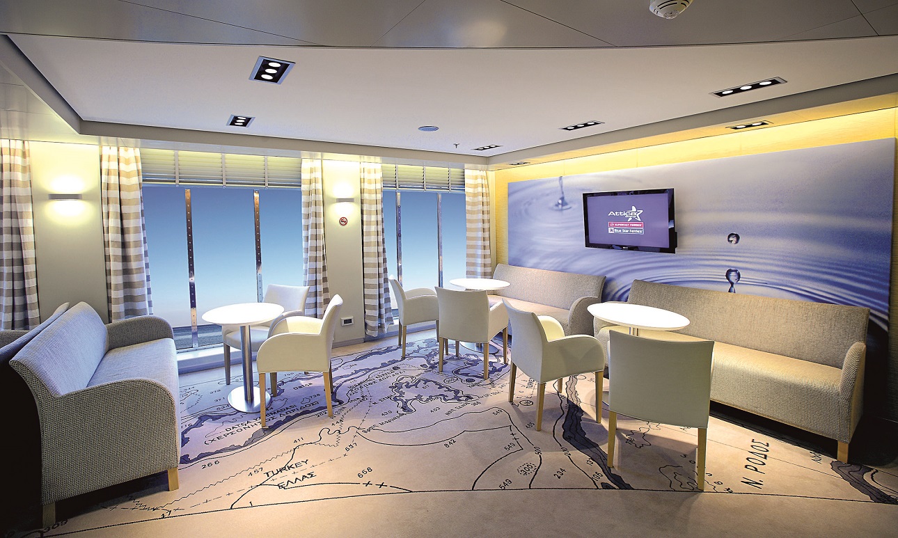 Μετά τη ρεσεψιόν, που θυμίζει λόμπι μεγάλου ξενοδοχείου, όπως άλλωστε σχεδόν όλοι οι εσωτερικοί χώροι του πλοίου, οι «φυλές» των επιβατών χωρίζονται. Εργασιομανείς με λάπτοπ σε ετοιμότητα ανεβαίνουν στο σαλόνι της πρώτης θέσης για να μπουν με την ησυχία τους στο εικονικό περιβάλλον του γραφείου τους, γιαγιάδες, οικογένειες και νεαρές-νεαροί πιάνουν θέσεις στα σαλόνια γύρω από τα μπαρ, τα πιτσιρίκια (που δεν παίζουν με το κινητό του μπαμπά τους ή με τη δική τους ταμπλέτα) έχουν εξασφαλίζει μπλοκ ζωγραφικής και ξυλομπογιές Bluestarino (είναι ο ήρωας που δημιουργήθηκε ειδικά για παιδιά), που θα απασχολήσουν τους λιλιπούτειους ταξιδιώτες ευχάριστα και δημιουργικά μέχρι να φθάσουν στον προορισμό τους.