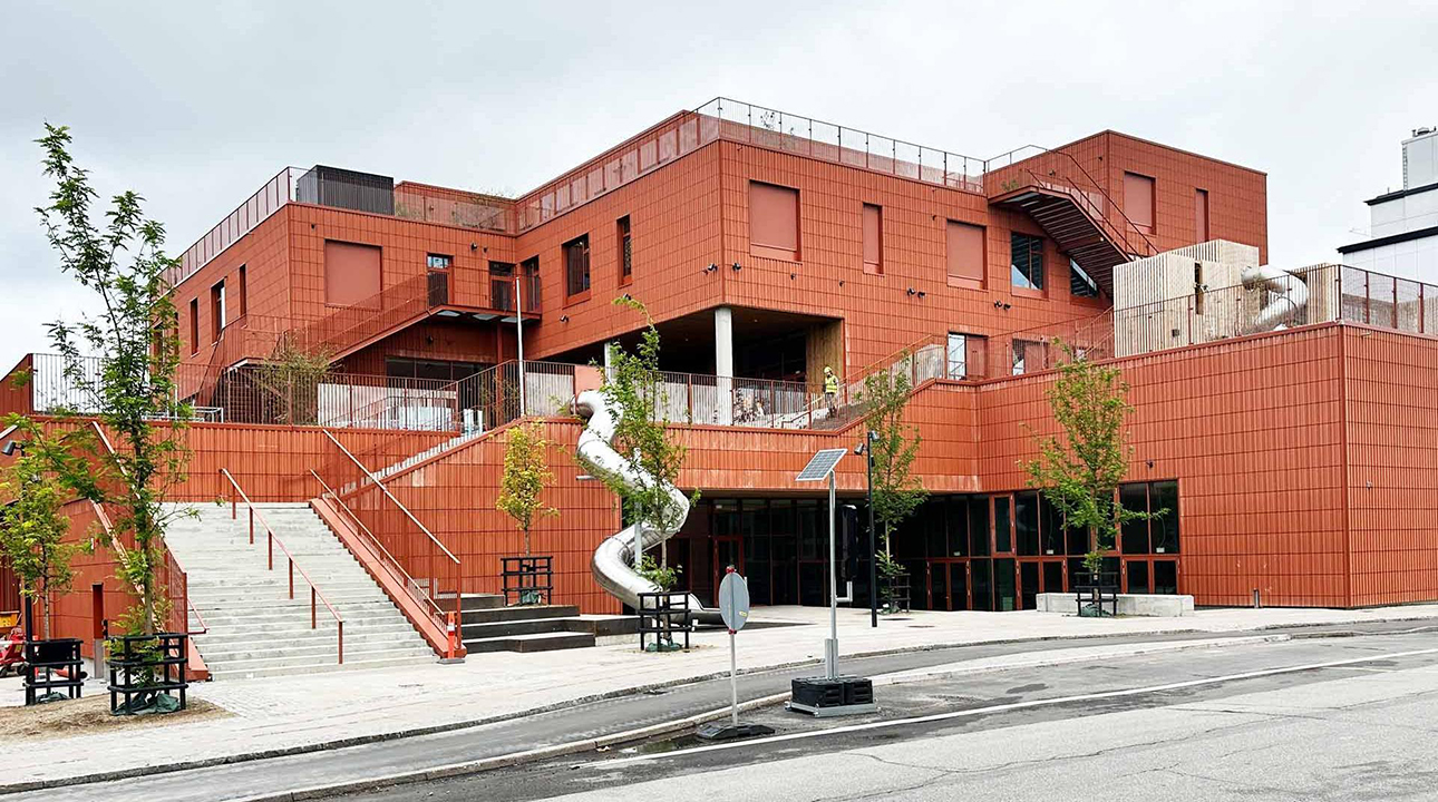 Τι προκαλεί εντύπωση με την πρώτη ματιά στο νέο σχολείο του Amager της Κοπεγχάγης; Το γεγονός ότι λείπει η γνωστή περίφραξη και οι χώροι του γίνονται κάποια στιγμή ένα με τον περιβάλλοντα χώρο της γειτονιάς. Ακριβώς αυτή η «ελεύθερη ζώνη» έχει πολλαπλές λειτουργίες, που καλούν τους μαθητές να αλληλεπιδράσουν με την αρχιτεκτονική. Προς τον δρόμο, για παράδειγμα, τα γραφεία Christensen & Co Architects και Kjaer & Richter Architects έχουν σχεδιάσει μεγάλες σκάλες που λειτουργούν τόσο ως «οροπέδιο» καθισμάτων όσο και ως χώρος προπόνησης. Οι ντόπιοι, εξάλλου, μπορούν να απολαύσουν ένα διάλειμμα κάτω από μεγάλα δέντρα, ενώ τα παιδιά διασκεδάζουν ακόμη και σε τοίχους αναρρίχησης ή τσουλήθρες. Εκτός από οργανωμένο σχολείο, πάντως, το κτίριο λειτουργεί ως κέντρο για δραστηριότητες μετά το σχολείο, για ενήλικες και για παιδιά. Ετσι, στο ισόγειο προσφέρεται πρόσβαση σε γυμναστήριο, εργαστήρια, χώρους κατασκευής και αμφιθέατρο.
