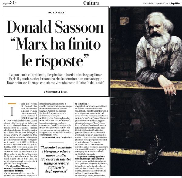 «Οι μαρξιστές του σήμερα έχουν πολλά προβλήματα. Ο κόσμος έχει αλλάξει πάρα πολύ και πρέπει να γίνουν νέες αναλύσεις» ήταν η απόφανση του Σασούν. Και μπορεί στη Repubblica να χαρακτήρισε την ταξική πάλη παρωχημένη έννοια μέσα στο κοινωνικό γίγνεσθαι, ωστόσο παραδέχθηκε ότι οι ανισότητες διευρύνονται αντί να συρρικνώνονται, φέροντας μάλιστα παραδείγματα όχι από τα τριτοκοσμικά γκέτο, αλλά από τα μισθολόγια των βρετανών επιστημόνων και από τον χώρο της Παιδείας γενικώς: «Μόνο εκείνοι που γεννιούνται σε μια πλούσια οικογένεια μπορούν να έρθουν να διδάξουν στο Λονδίνο. Ετσι έχουμε πνευματικές ελίτ, γεννήματα της ελίτ του κεφαλαίου».