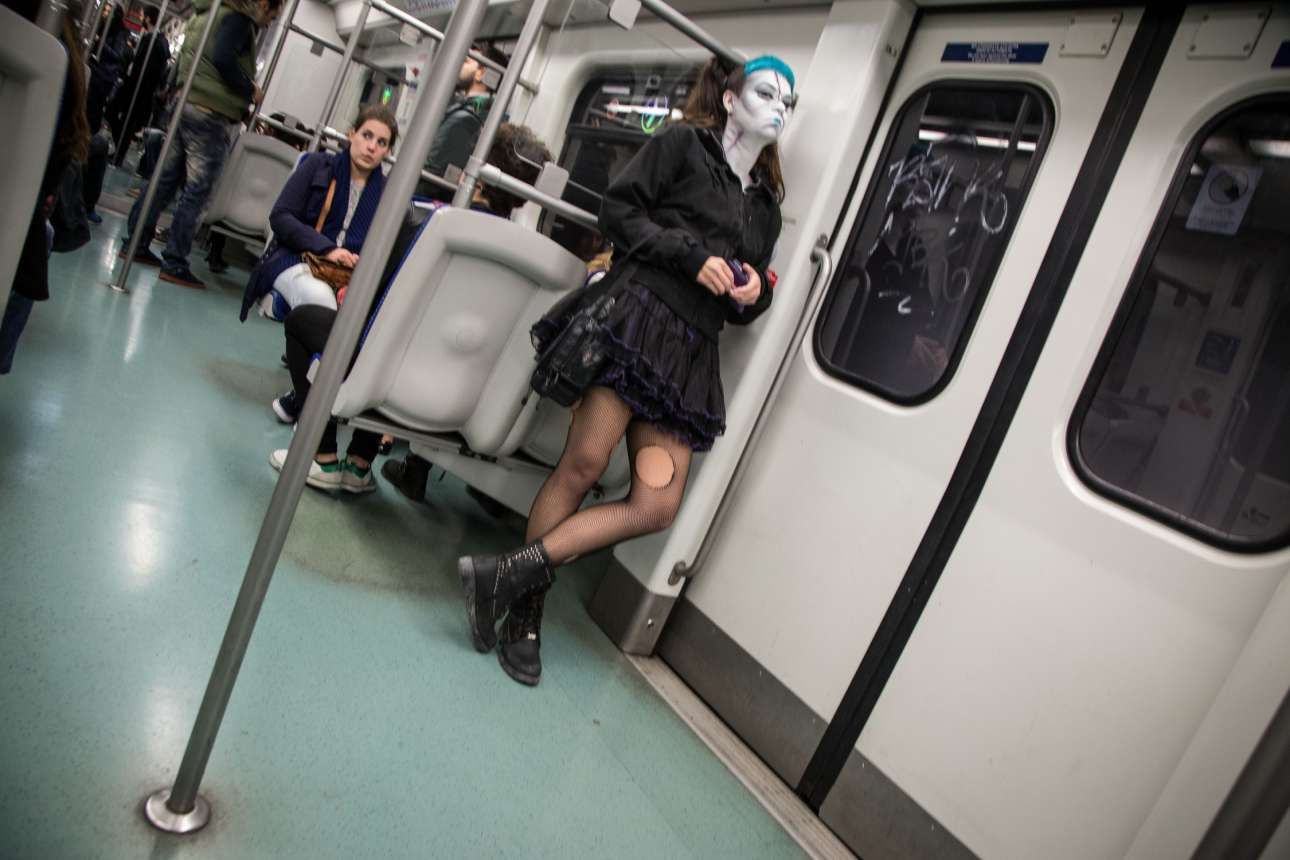 Κατευθυνόμενη προς τη μπλε γραμμή, αφήνω το λαλίστατο γεροντάκι που συνεχίζει να παρλάρει ενώ βρίσκεται από πίσω μου και αποφασίζω να μην μπω στον ίδιο συρμό μαζί του, αλλά να πάρω τον επόμενο. Και εκεί που πιστεύω ότι έχω ξεμπερδέψει από την παράνοια, τρέχουν για να προλάβουν να χωθούν σε ένα παραγεμισμένο βαγόνι, δύο χαμογελαστοί άνδρες που είναι ντυμένοι…Σαρλό, κανονικότατα, με μαύρο κοστούμι, καπελάκι και μπαστούνι.