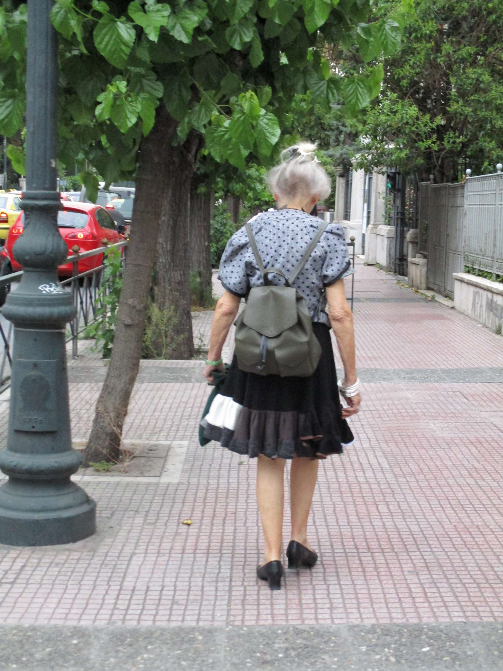 Μία κομψότατη κυρία ηλικίας 70 και κάτι, με νεανικότητα που θα ζήλευαν και 20άρες και στιλ που θα ξεπατίκωναν όλες οι fashion bloggers, μου τράβηξε το βλέμμα και ξύπνησε μέσα μου άγρια ένστικτα παπαράτσι, καθώς έτρεχα από πίσω της με τη φωτογραφική μου μηχανή, προκειμένου να την απαθανατίσω. Με τετράγωνα τακουνάκια που παραπέμπουν στο παιχνιδιάρικο στιλ της αγαπημένης Νταίζη Ντακ, κλος φούστα με γκρι λεπτομέρειες, πουά κοντομάνικο πουκαμισάκι, λαδί σακίδιο και τα ολόλευκα μαλλιά της επιμελώς ατημέλητα πιασμένα σε ψηλό κότσο με τρία κλάμερ, περπατούσε γρήγορα και αποφασιστικά, παραδίδοντας ταχύρρυθμα μαθήματα στιλ. Οταν την είδα και από μπροστά, το επιτυχημένο λουκ ολοκληρωνόταν με έναν τεράστιο λευκό γιακά πάνω από το πουκάμισό της. Και τότε έκανα μία ευχή: να φτάσω στα χρόνια της, και να έχω ακόμη την ίδια όρεξη να διαλέγω και να φοράω ρούχα που μου φτιάχνουν το κέφι.