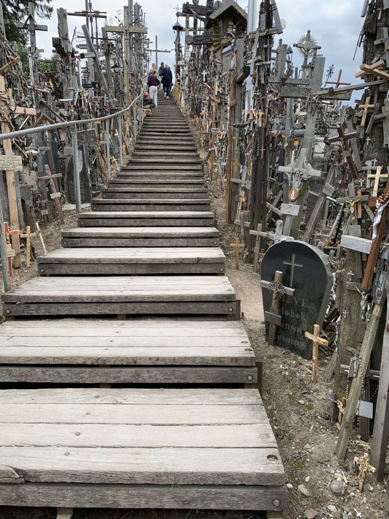 Για τον «Λόφο των Σταυρών» θα βγαίναμε από την πορεία μας αλλά αποφασίσαμε ότι δεν γινόταν να χάσουμε, το περίεργα ενδιαφέρον αξιοθέατο. Ξεκίνησε ως καθολικό έθιμο. Πιστεύεται, ότι οι πρώτοι σταυροί τοποθετήθηκαν μετά από μια μεγάλη εξέγερση των Λιθουανών το 1831 -ως μέλη τότε της Ρωσικής Αυτοκρατορίας- εναντίον των ρωσικών αρχών. Οι οικογένειες που δεν μπορούσαν να βρουν για να θάψουν τα άψυχα σώματα των συγγενών τους τοποθετούσαν συμβολικά έναν σταυρό. Αυτό όμως απλώθηκε στον χρόνο, ο πόνος τράβηξε συρτή τον πόνο, η απώλεια συρτή την απώλεια…