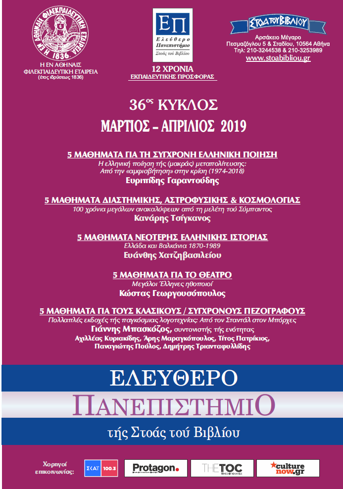 Την Τρίτη 19 Μαρτίου ξεκινά νέος κύκλος μαθημάτων στο Ελεύθερο Πανεπιστήμιο της Στοάς τού Βιβλίου. Ο 36ος κύκλος περιλαμβάνει μαθήματα για την ποίηση και την πεζογραφία, την αστροφυσική, το θέατρο, την ελληνική ιστορία.