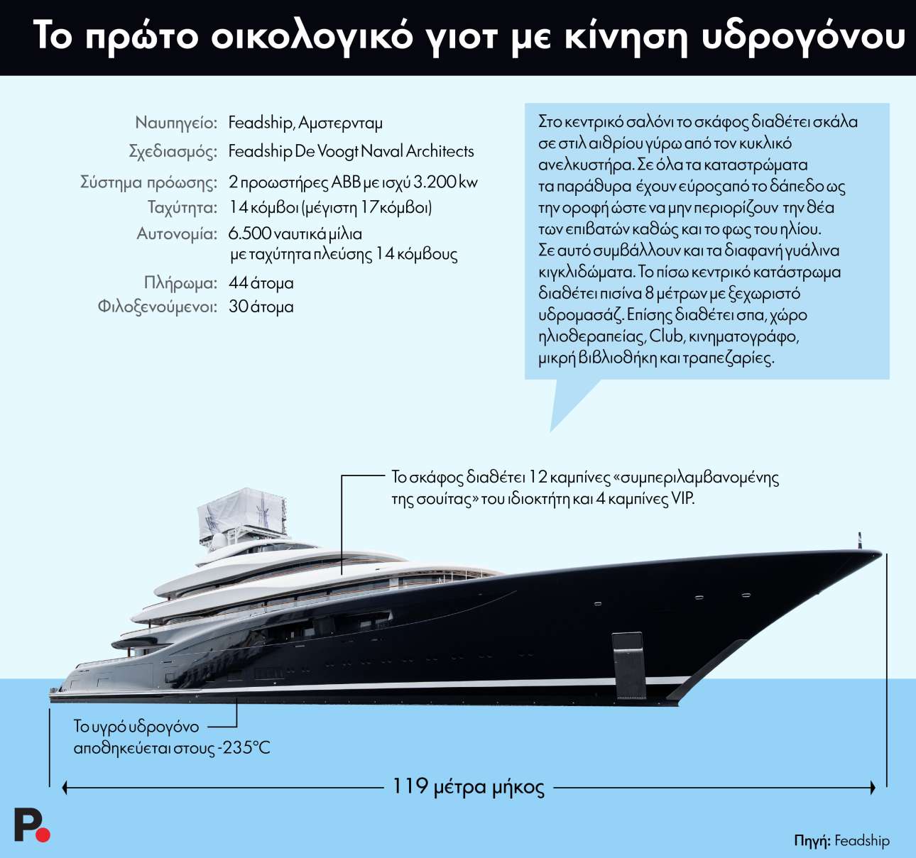 Ωστόσο, σε αντίθεση με άλλα σούπερ γιοτ, το σκάφος του Γκέιτς, σύμφωνα με την Telegraph, είναι μοναδικό στο ότι περιέχει ένα σύστημα ενέργειας υδρογόνου, συμπεριλαμβανομένης μιας κρυογονικής δεξαμενής που διατηρεί 92 κυβικά μέτρα υγροποιημένου υδρογόνου στους μείον 253°C.