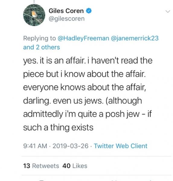 Ομως αυτή η στάση παραξένεψε πολλούς. Γιατί, σου λέει, οι Γουίλιαμ και Κέιτ, κυρίως αυτοί, που είναι πρώτο θέμα σε όλα τα celebrity news κάθε ημέρα, εξετάζουν το ενδεχόμενο να προσβάλουν δικαστικά τη συγκεκριμένη σπερμολογία; Εδώ δεν το έκαναν για την πολύ πιο επιζήμια ιστορία της υποτιθέμενης διαμάχης της Κέιτ με τη Μέγκαν Μαρκλ, τη σύζυγο του Χάρι, και θα το κάνουν για τη Ρόουζ; Πάνω στη βράση εμφανίστηκε ένα tweet από κάποιον Τζάιλς Κόρεν  το οποίο σχολίαζε την υπόθεση ως εξής: «Ολοι γνωρίζουν για το θέμα, αγάπη μου». Το tweet θεωρήθηκε ότι υποδείκνυε τον έρωτα που αναπτύχθηκε μεταξύ των Γουίλιαμ και Ρόουζ – και για αυτόν τον λόγο εξηφανίσθη ταχύτατα από προσώπου Twitter.