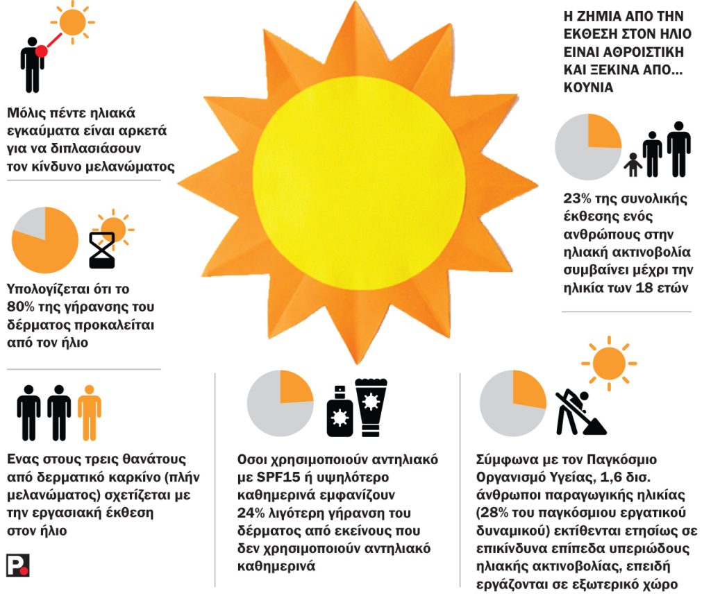 - Η ζημιά από την έκθεση στον ήλιο είναι αθροιστική και ξεκινά από την… κούνια: το 23% της συνολικής έκθεσης ενός ατόμου στην ηλιακή ακτινοβολία έχει επέλθει μέχρι την ηλικία των 18 ετών.