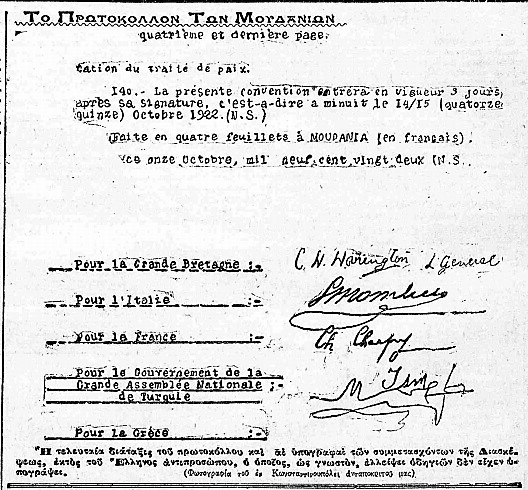 Το λιγότερο γνωστό είναι ότι η ελληνική αντιπροσωπεία δεν κατάφερε να αποβιβαστεί στα Μουδανιά, παραμένοντας αποκλεισμένη στο «συμμαχικό» πλοίο. Το τελικό κείμενο της ανακωχής διαμορφώθηκε χωρίς ελληνική συμμετοχή ή συμφωνία. Ορίστηκε ως νέο σύνορο ο ποταμός Έβρος και η εκκένωση της Ανατολικής Θράκης να γίνει μέσα σε 15 ημέρες, οπότε ξεριζώθηκαν από την πατρογονική γη τους πάνω από 200.000 Ελληνες. Ιστορικοί προσθέτουν ότι θανατώθηκαν πάνω από 16.000 Έλληνες της Θράκης κατά τον εκπατρισμό τους.