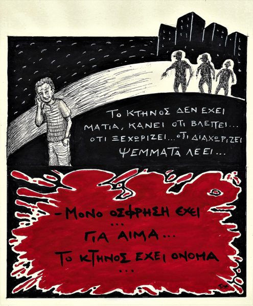 «Το Κτήνος δεν έχει μάτια, κάνει ότι βλέπει… ότι ξεχωρίζει… ψέματα λέει. Μόνο όσφρηση έχει… για αίμα. Το Κτήνος έχει όνομα». Η «ατάκα» συνοδεύει ένα από τα 50 σκίτσα που περιλαμβάνει η καμπάνια «Βάλτους Χ – Ο Μαύρος Χάρτης της Αθήνας », στο πλαίσιο του πρωτότυπου και θαρραλέου εγχειρήματος που υπογράφουν το Ίδρυμα Ρόζα Λούξεμπουργκ και η οργάνωση HumanRights 360 – στην Τεχνόπολη του δήμου Αθηναίων, στο Γκάζι, από την Τετάρτη 13 Μαρτίου ως και την Κυριακή 17 Μαρτίου.