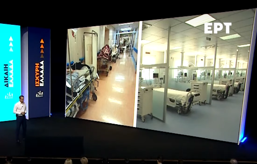 «Θέλουμε την δεξιά εικόνα, δεν θέλουμε την αριστερή εικόνα (σ.σ.: τα ράντζα). Πώς θα το πετύχουμε; Με το να εκσυγχρονίσουμε σε 80 νοσοκομεία τα τμήματα επειγόντων περιστατικών και να ανακαινίσουμε δραστικά και τα 156 Κέντρα Υγείας της χώρας με πόρους του Ταμείου Ανάκαμψης» είπε μπροστά στις δύο φωτογραφίες ο κ. Μητσοτάκης.