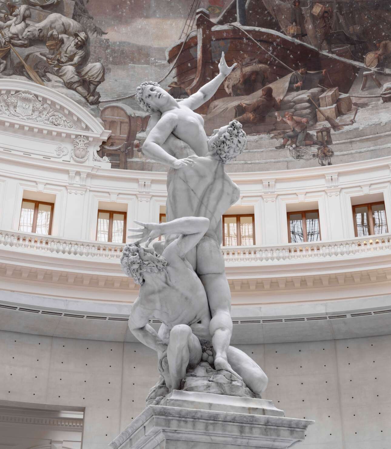 Ωστόσο, η τέχνη που προβάλλεται σε οθόνες εξισορροπεί τον ρατσισμό της τοιχογραφίας μιας άλλης εποχής. Στον δεύτερο όροφο, το πορτρέτο μιας νεαρής μαύρης, έργο της Βρετανογκανέζας ζωγράφου Λινέτ Γιαντόμ-Μποάκιε, κρέμεται δίπλα σε ένα εσωτερικό παράθυρο μέσα από το οποίο είναι ορατή η αποικιακή τοιχογραφία. Λειτουργεί σχεδόν σαν μια λεπτή οπτική επίπληξη, εξηγεί ο Μαρτίν Μπετενό, διευθύνων σύμβουλος της συλλογής Πινό στο Bourse de Commerce: «Η τέχνη μπορεί να μας βοηθήσει να αναπλαισιώσουμε το παρελθόν του κτιρίου», λέει.